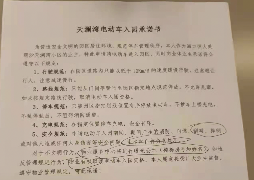 对于电动车的管理,物业倒是出了免责条款:丢失、损坏、安全事故等,责任业主自负。