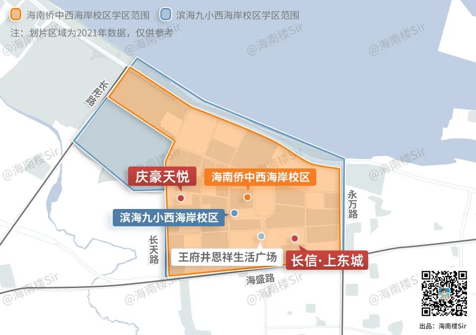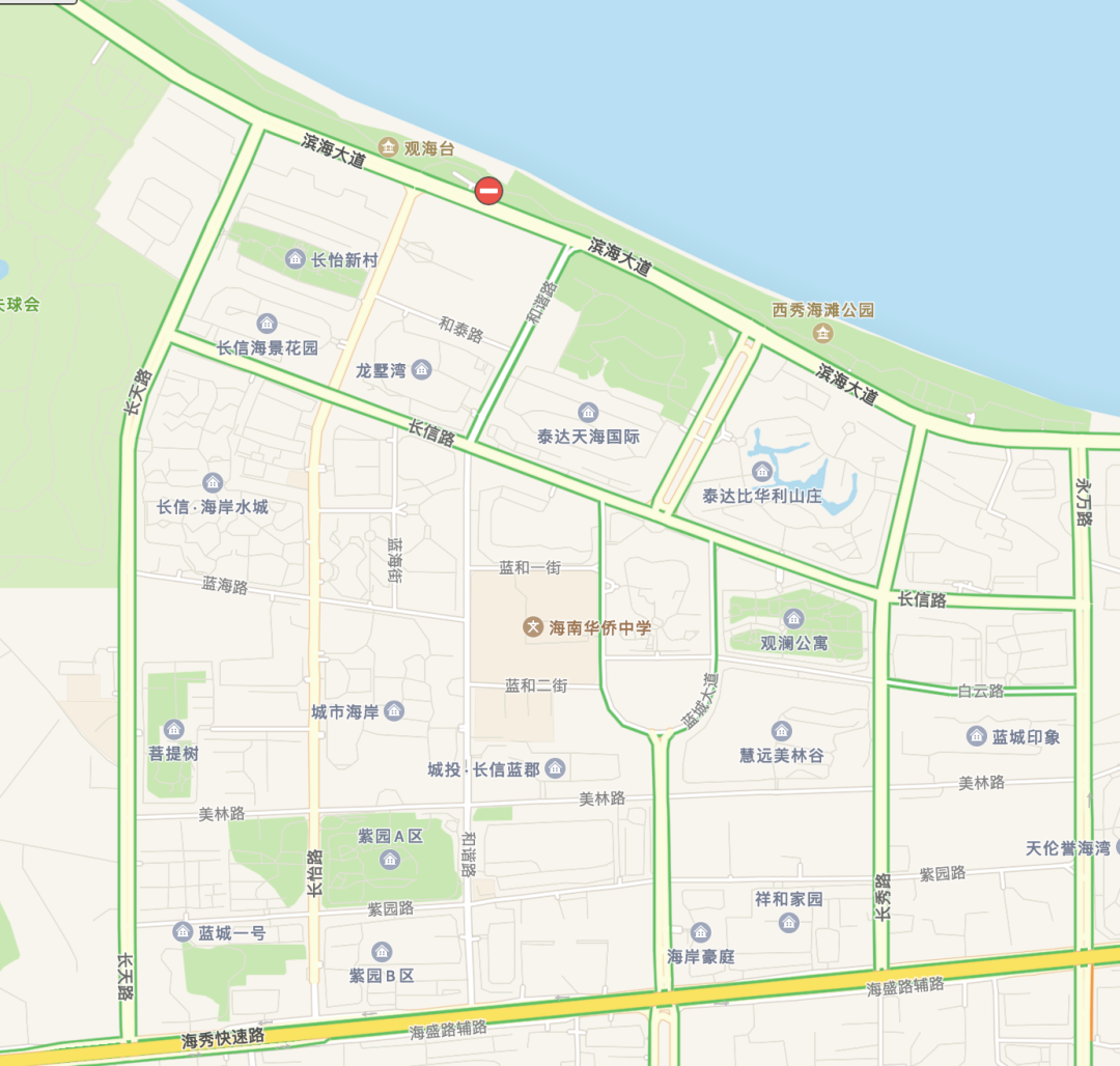 从地图上就可以看出,整个居住区以滨海九小(西海岸校区)、海南侨中(西海岸校区)两所学校为核心,道路四横五纵,横平竖直,排布十分整齐。