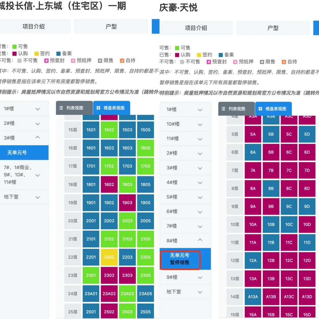 楼Sir顺手查了下海口市住建局一房一价系统,上东城显示还有房源未售,庆豪天悦去年10月拿证的楼栋则全部为认购和备案,且目前都是暂停销售状态。