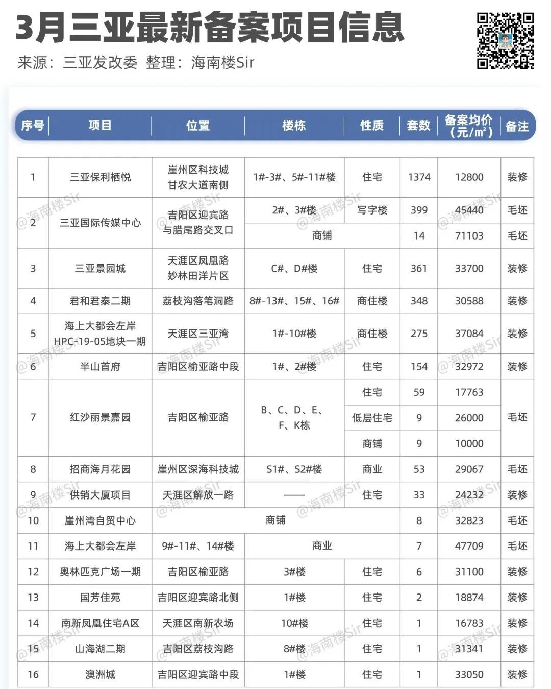 看这个表,近期,三亚又有16个项目公示了销售备案价,房源最多的是三亚保利栖悦,1374套,12800元/㎡。这个价格,不用说,不是市场化房源。