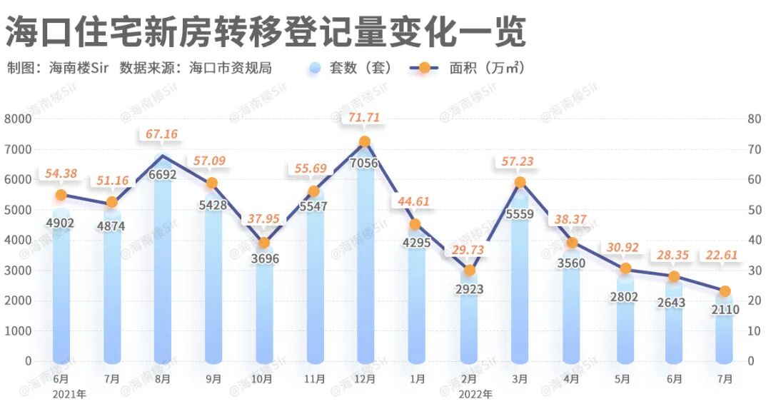 看看下边的图就知道了,海口的新房转移登记从3月开始就一路下滑,7月仅仅只有2110套,也就意味着,卖出的房子是一天比一天少,买房的人也是如此。