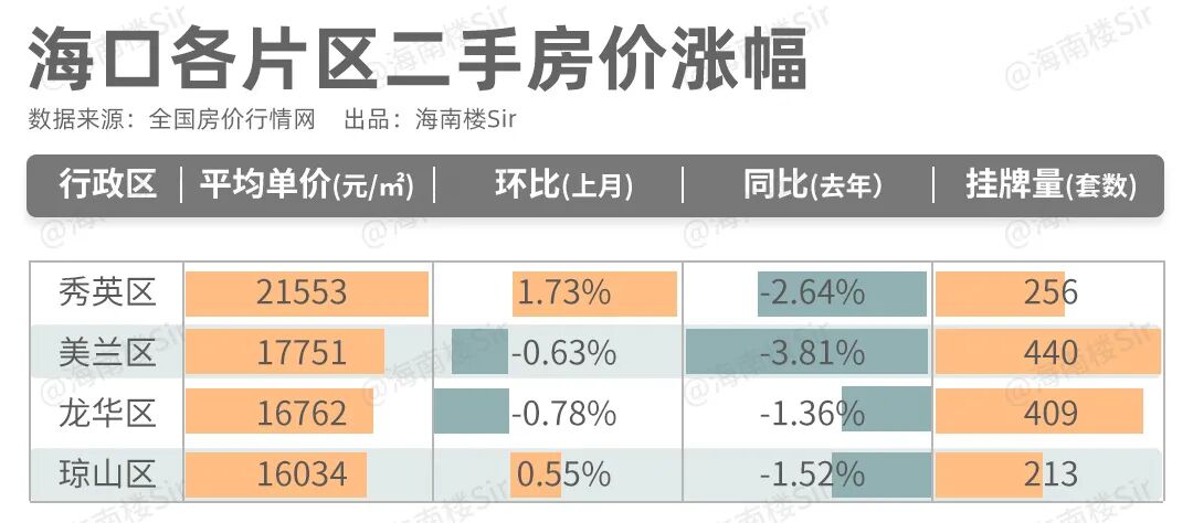 排名前列的依旧是秀英区,占位最多的是美兰区的楼盘,一共有6个,二手房挂牌价基本也在下降。