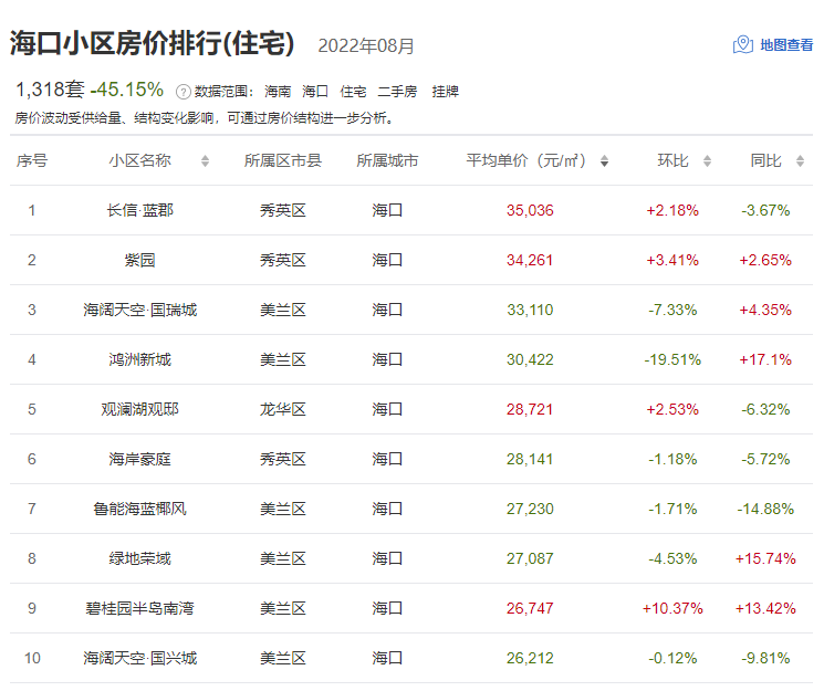看完涨幅,再看看8月海口二手房价排行。