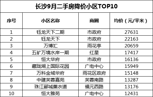 长沙9月二手房降价排名表 数据来源:诸葛找房