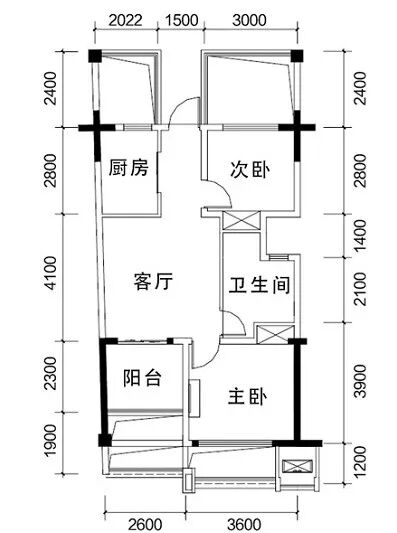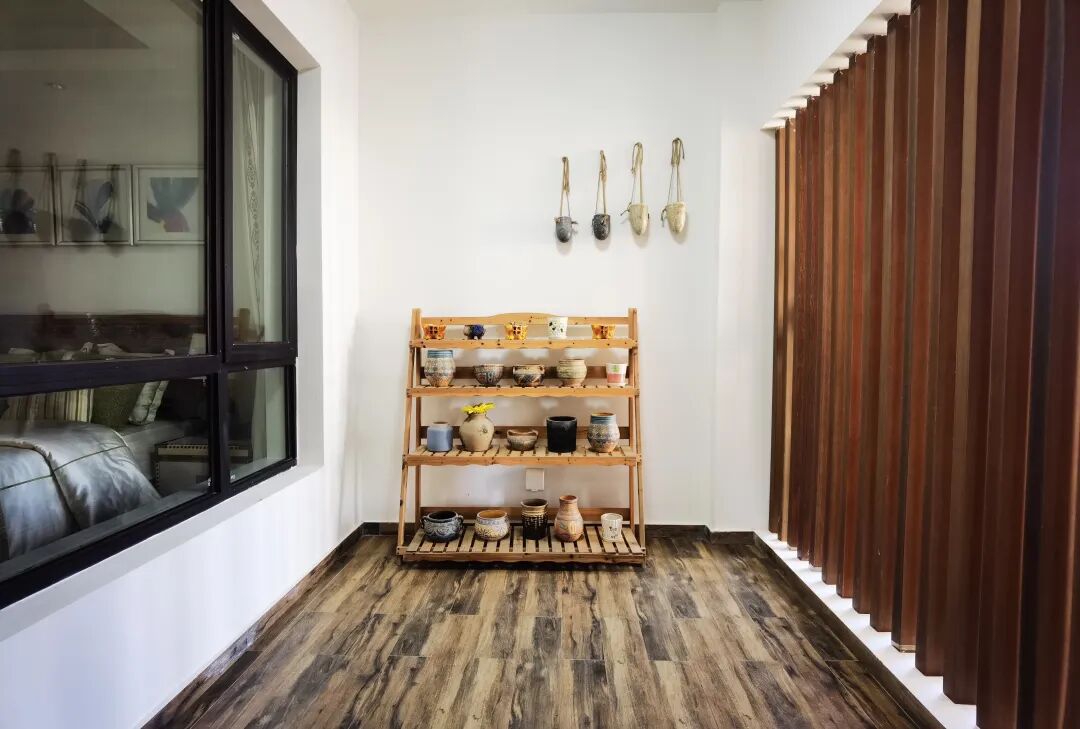 原本格局是两房一厅的设计,阳台很多位置全部做成镂空,进门还有两个镂空的位置。不算赠送面积的话,是个挺普通的两房带阳台设计。次卧2.8x3,主卧3.6x3.9,在这个面积段也不算小了,唯一就是缺个独立餐厅,样板间把餐厅放在了阳台上。
