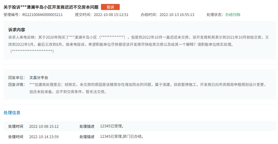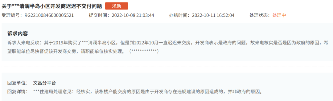 2、求助:其于2019年购买了***清澜半岛小区,但是到2022年10月一直迟迟未交房,开发商表示是政府的问题,故来电核实是否是因为政府的原因,希望职能单位尽快督促该开发商交房,请职能单位核实处理。(提交时间:2022-10-08 21:03:44,办结时间:2022-10-11 16:52:04)
