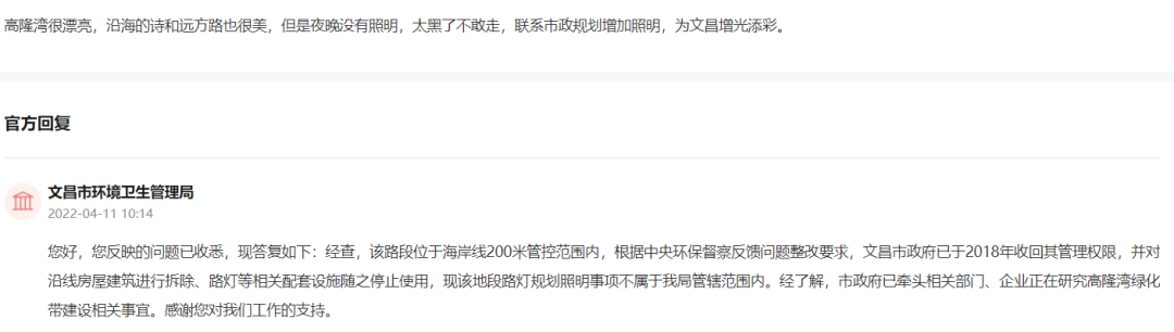 文昌市环卫局回复:经查,该路段位于海岸线200米管控范围内,根据中央环保督察反馈问题整改要求,文昌市政府已于2018年收回其管理权限,并对沿线房屋建筑进行拆除、路灯等相关配套设施随之停止使用,现该地段路灯规划照明事项不属于我局管辖范围内。