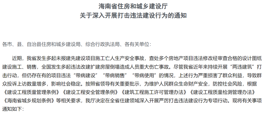 《关于深入开展打击违法建设行为的通知》说到:“近期,我省发生多起未报建先建设项目施工亡人生产安全事故,查处多个房地产项目违法修改经审查合格的设计图纸建设施工、销售,全国发生多起违法改建扩建房屋倒塌造成人员重大伤亡事故。”