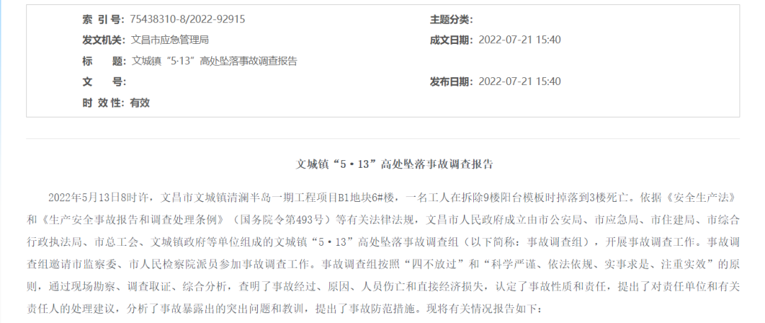 在文昌市政府网站上,有一则《文城镇“5.13”高处坠落事故调查报告》: