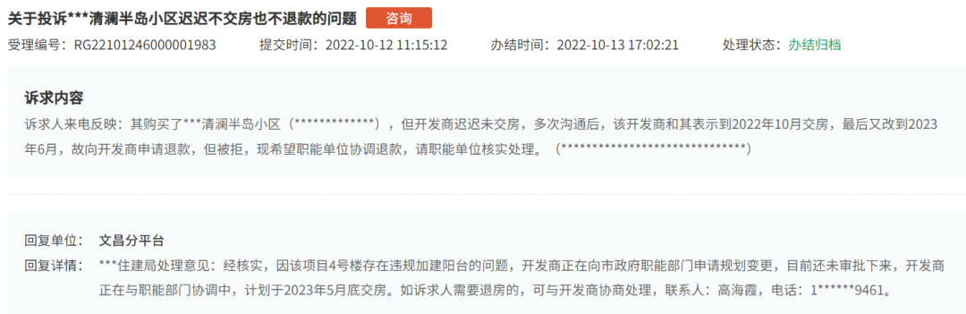 3、咨询:其购买了***清澜半岛小区,但开发商迟迟未交房,多次沟通后,该开发商和其表示到2022年10月交房,最后又改到2023年6月,故向开发商申请退款,但被拒,现希望职能单位协调退款,请职能单位核实处理。(提交时间:2022-10-12 11:15:12,办结时间:2022-10-13 17:02:21)