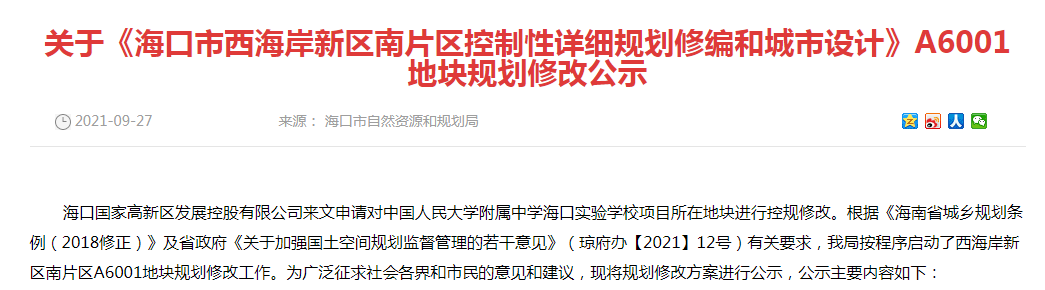 当然,没有反转。不过楼Sir 发现,原来这个控规修改是关于中国人民大学附属中学海口实验学校的!