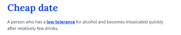 实际上,cheap date是一个美式俚语。根据字典里的含义,它是这样解释的:
