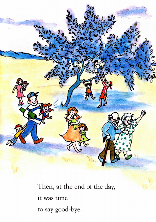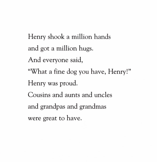 一天时间很快就过去了,最后,大家互相道别,亲戚们都说Henry有一只很好的狗,Henry听后很自豪,他觉得Mudge是最棒的家庭成员!