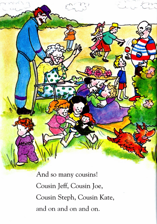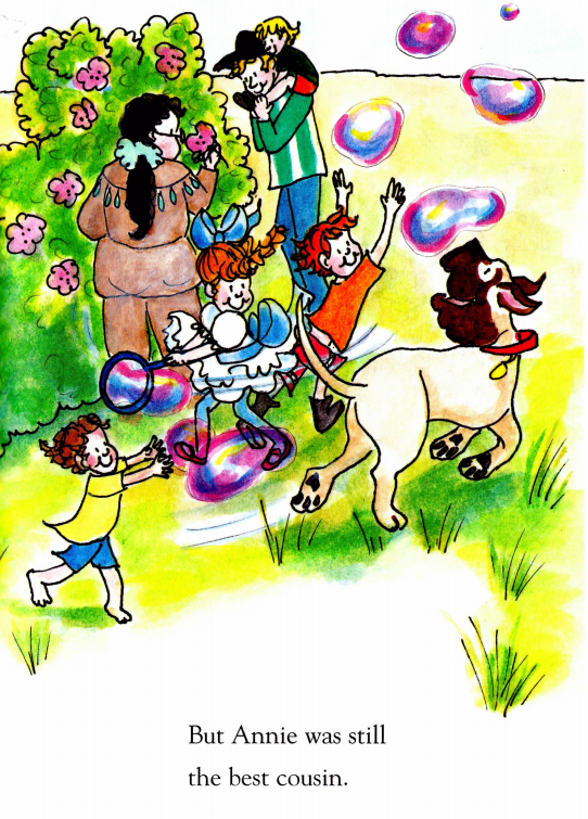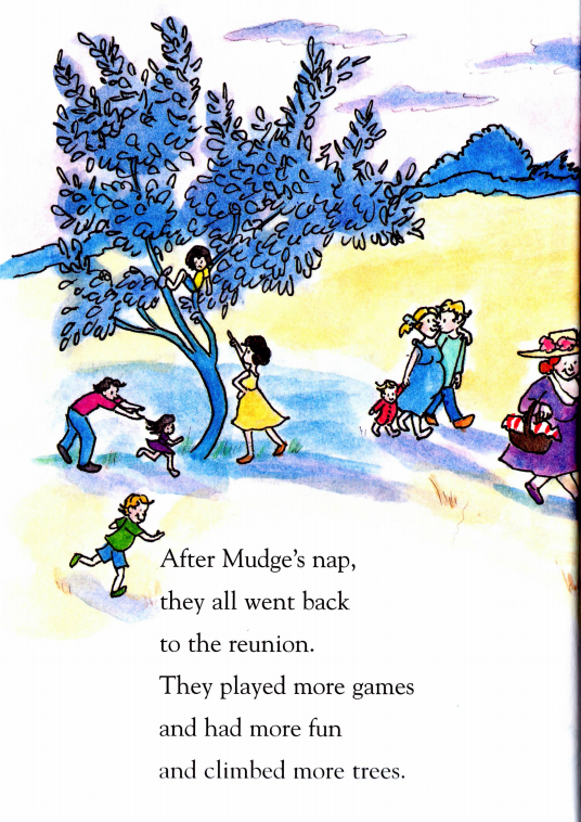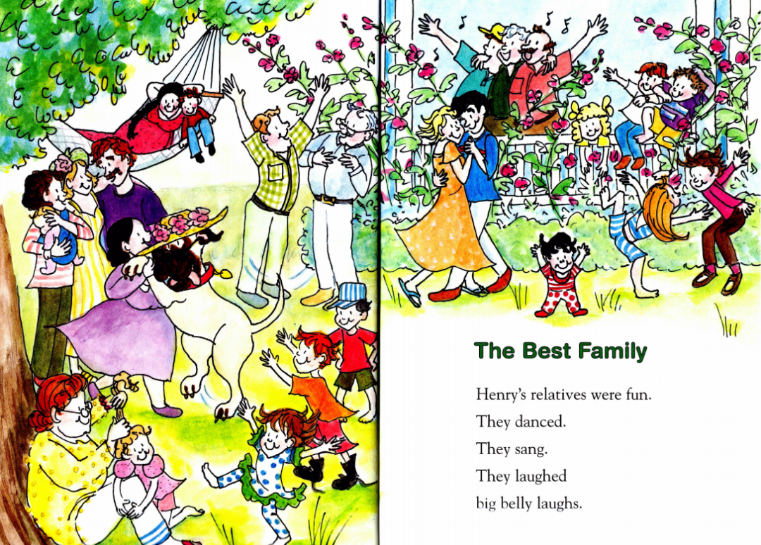 在Annie家举行的家庭聚会很热闹,大家唱歌跳舞,开怀大笑。Henry认识了很多同辈的兄弟姐妹,还与几位阿姨叔叔爷爷奶奶以及Annie一起玩了飞盘,当然Mudge也参与其中。当他们玩累了,Henry和Mudge一起去了Annie的房间,Henry和Annie又玩了会儿潜艇游戏,而Mudge则小睡了一觉。