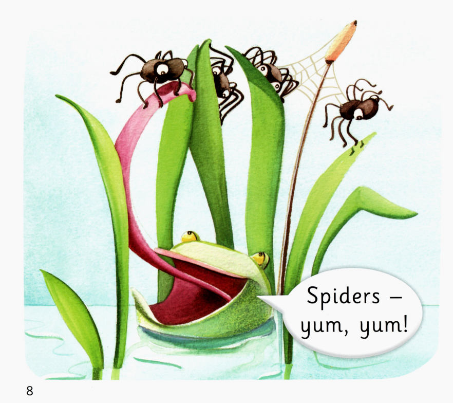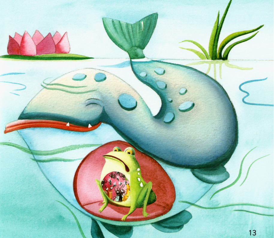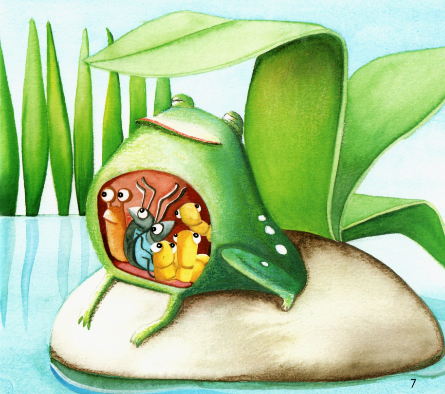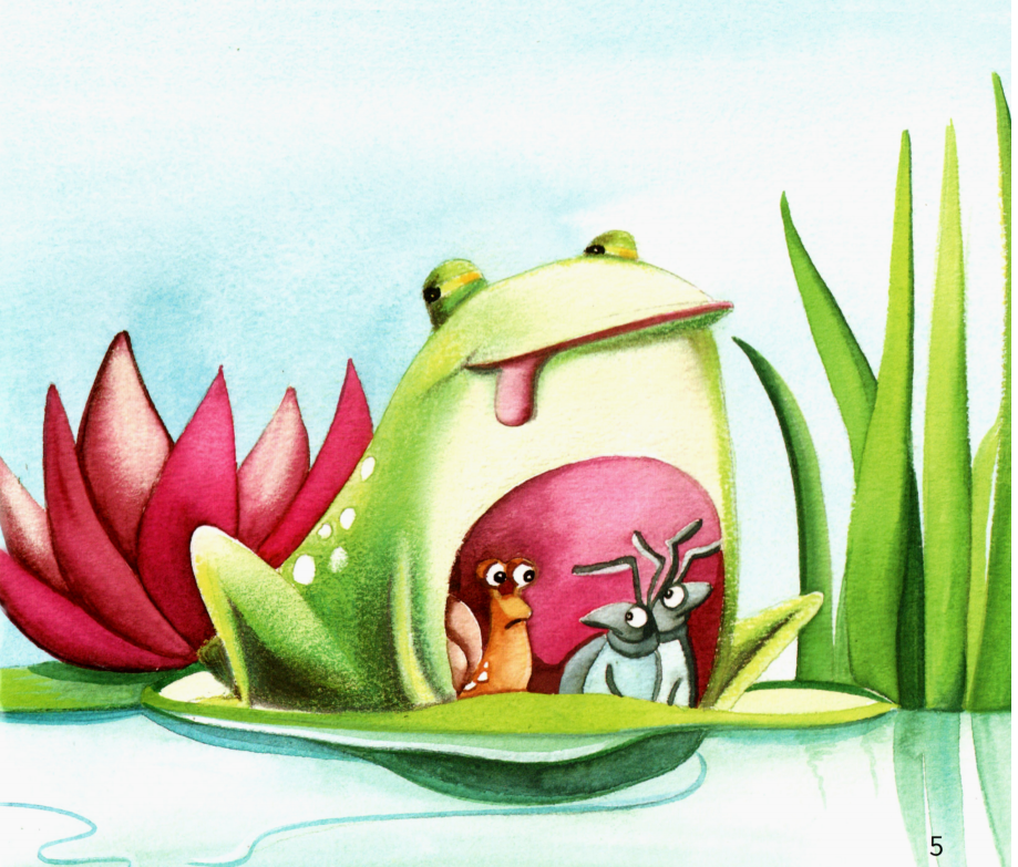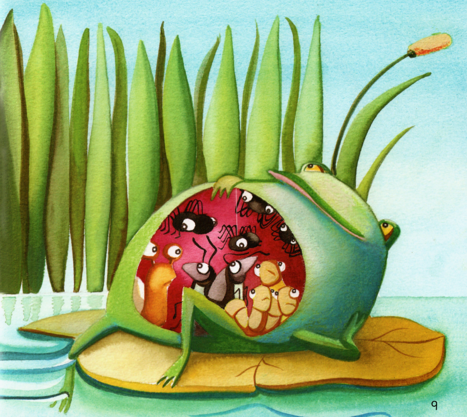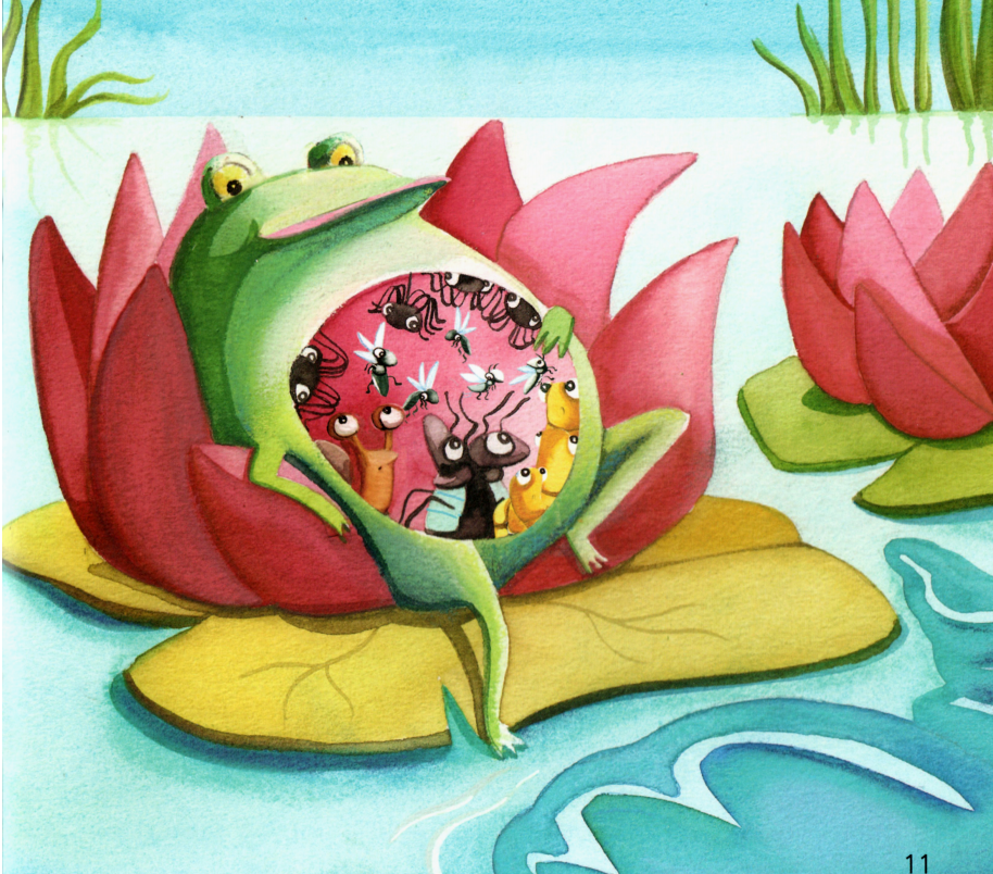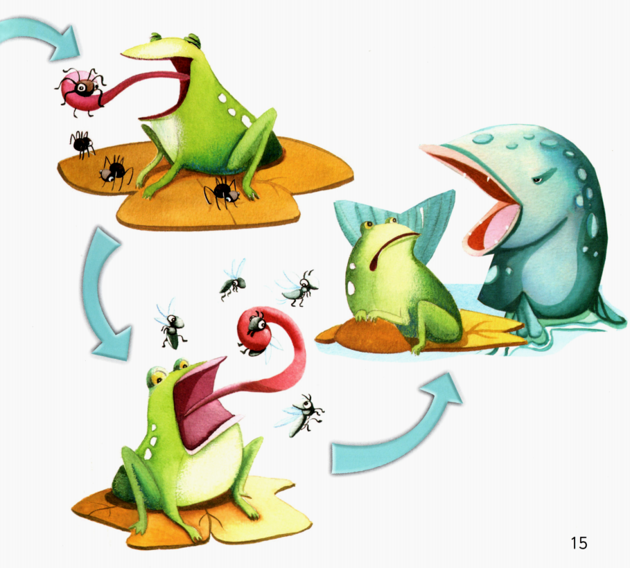 今天的绘本让小朋友们认识了很多小动物,比如:蜗牛、甲虫、蠕虫、蜘蛛、苍蝇等,它们都是青蛙的美食。而吃饱了的青蛙最后又成为了大鱼的美食