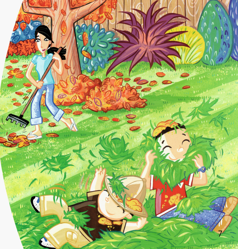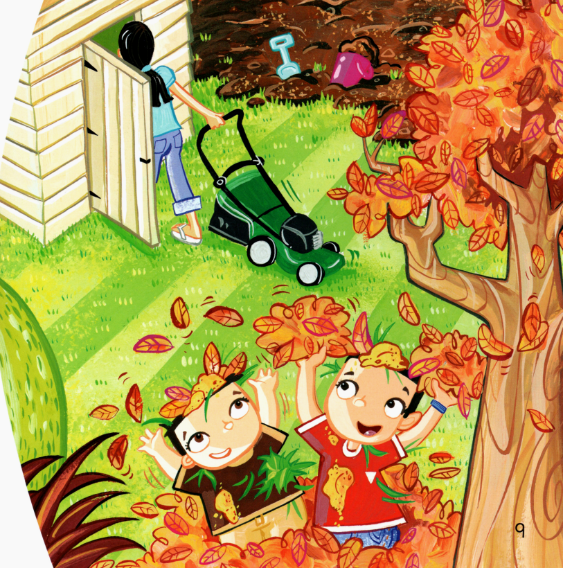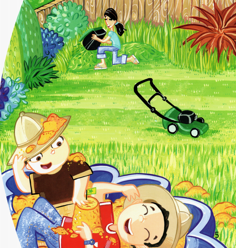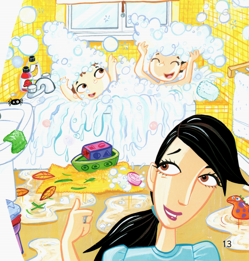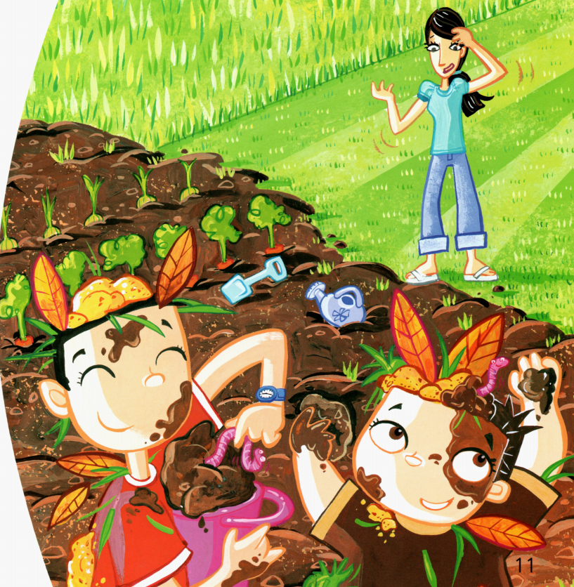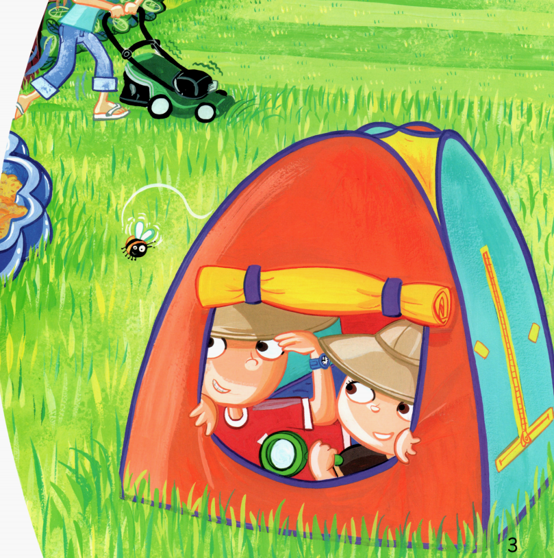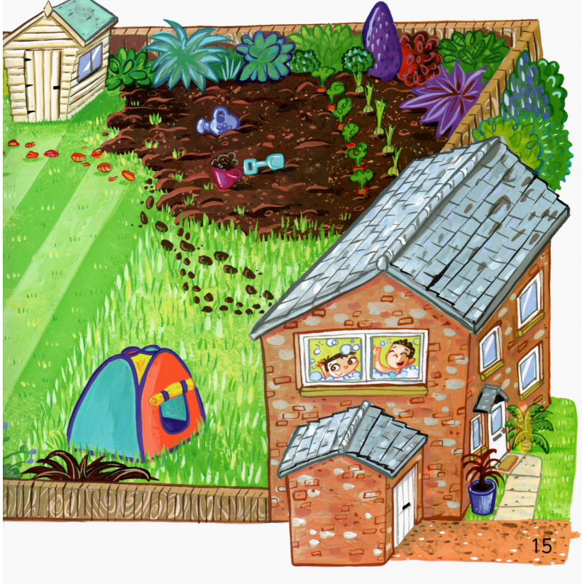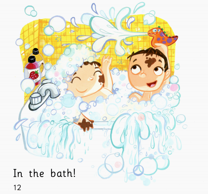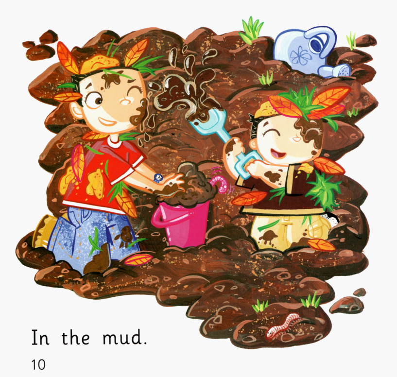 今天的绘本里有两个小朋友,他们在自家的花园里玩得很开心。一会儿跑到帐篷里,一会儿跳进沙坑里,一会儿又去玩草、玩树叶,最后还玩起了泥巴,搞得浑身脏兮兮的,那必须去浴缸里洗干净才行了