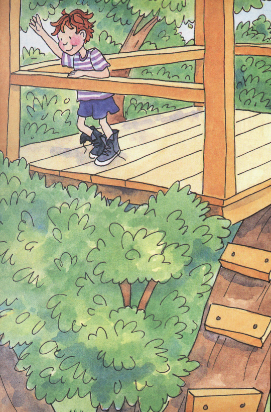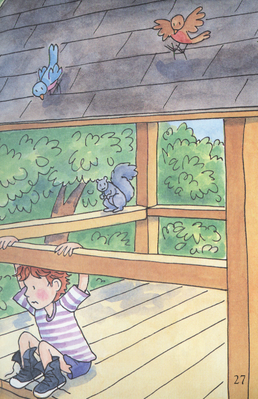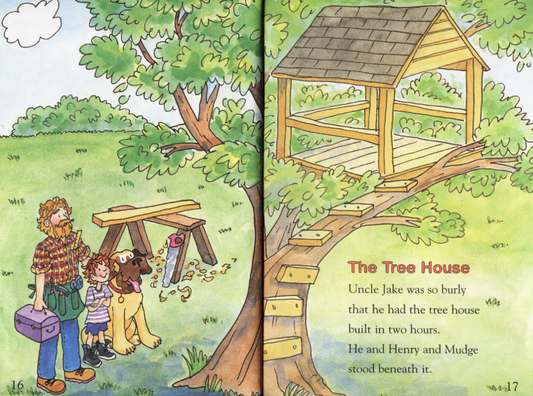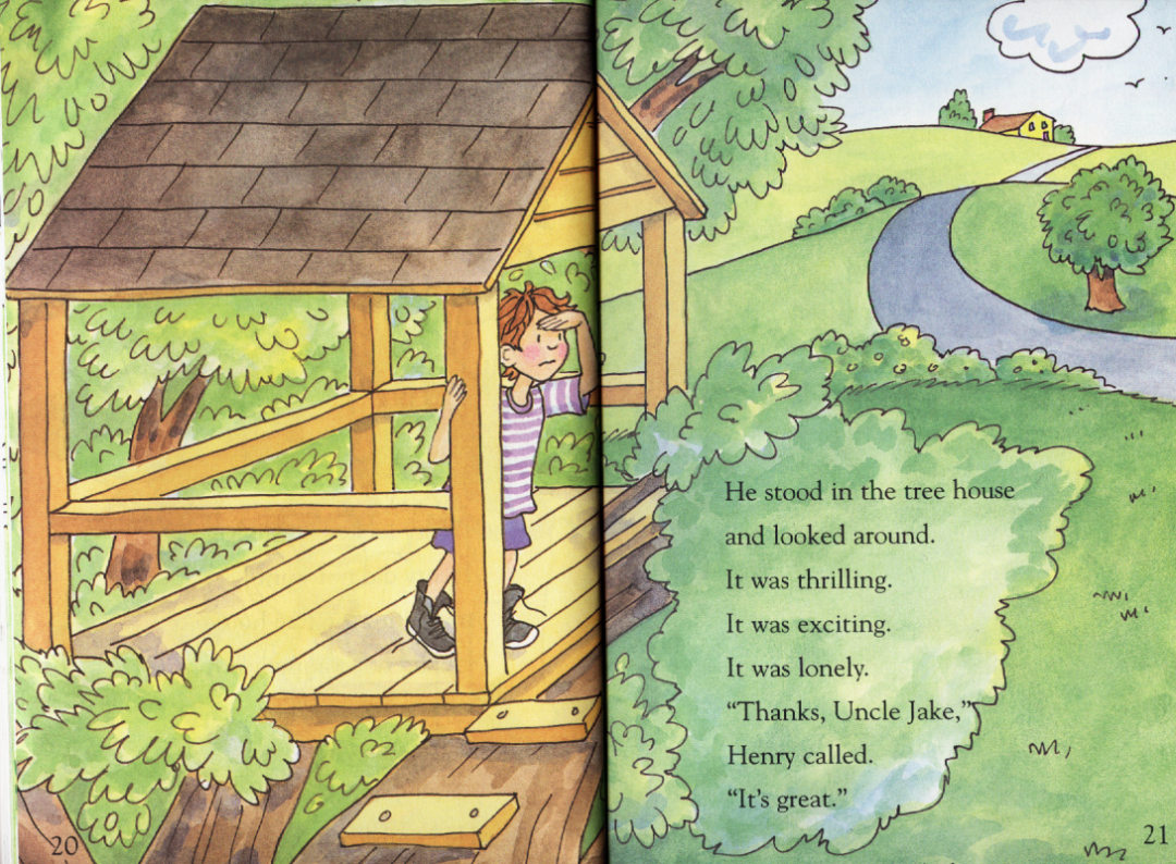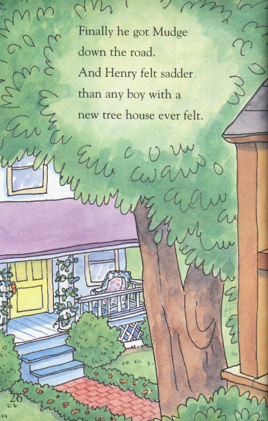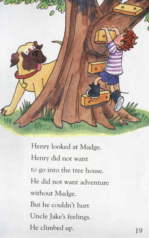 Jake叔叔真的很能干,两个小时就把树屋建好了。他很自豪地跟Henry说,这个树屋是Henry的了。可Henry却开心不起来,因为Mudge上不去,他不喜欢没有Mudge的冒险。但Henry是个善良的男孩儿,他没有说扫兴的话伤害Jake叔叔,还是爬上了树屋,并感谢了Jake叔叔。而Mudge坐在树下,哪儿也不想去。最后Jake叔叔带Mudge去散步了,而Henry一个人在树屋上很孤独。