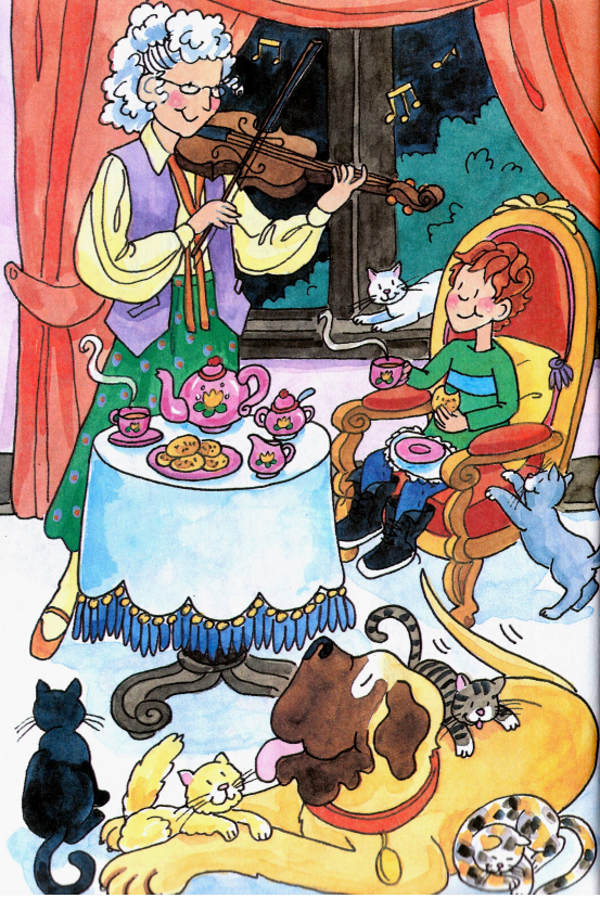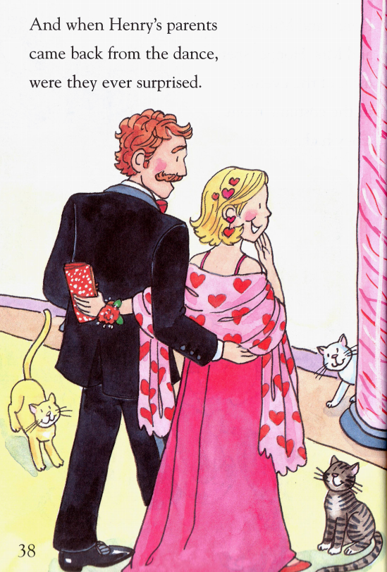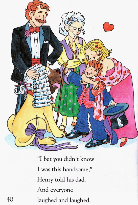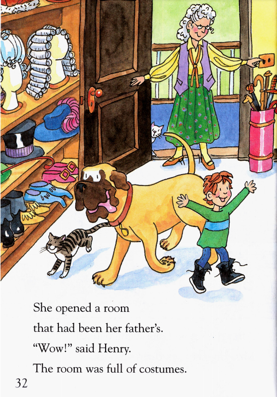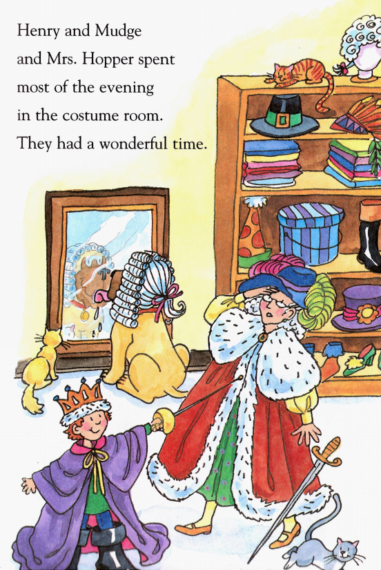 Hopper太太很友善,她为Henry拉小提琴,为他泡茶,还很喜欢Mudge, 为Mudge准备了燕麦粥和法国面包。吃喝之后,Hopper太太带他们去了Hopper太太父亲的房间,她父亲曾是一位著名的演员,所以他的房间里摆满了戏服和各种饰物。当Henry父母从舞会回来看到他们时,非常惊讶:Mudge带了个假发,变成了一只贵宾犬,Henry穿着燕尾服,戴着高帽,穿着闪亮的黑皮鞋,变成了一个大人。“我打赌你不知道我会这么帅。”Henry说完,每个人都哈哈大笑起来!(本书完!)