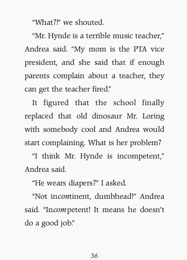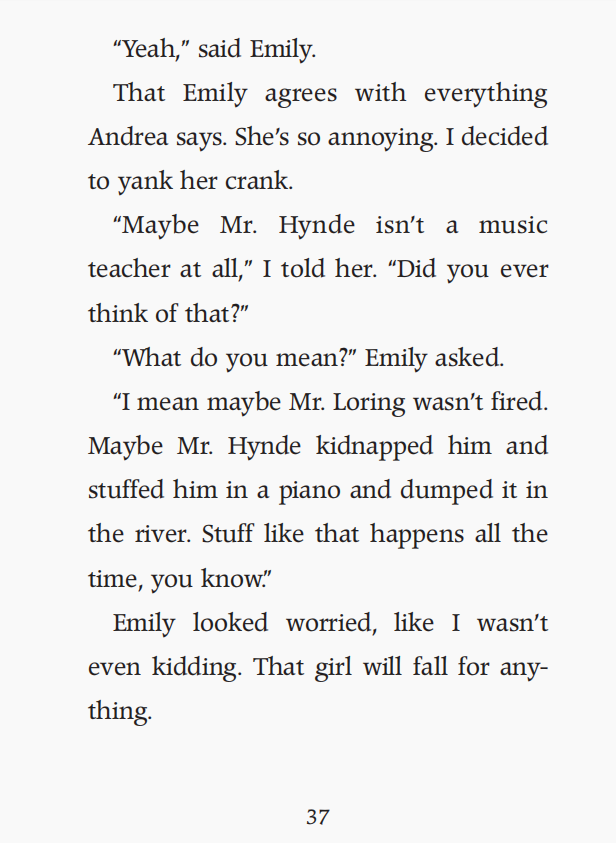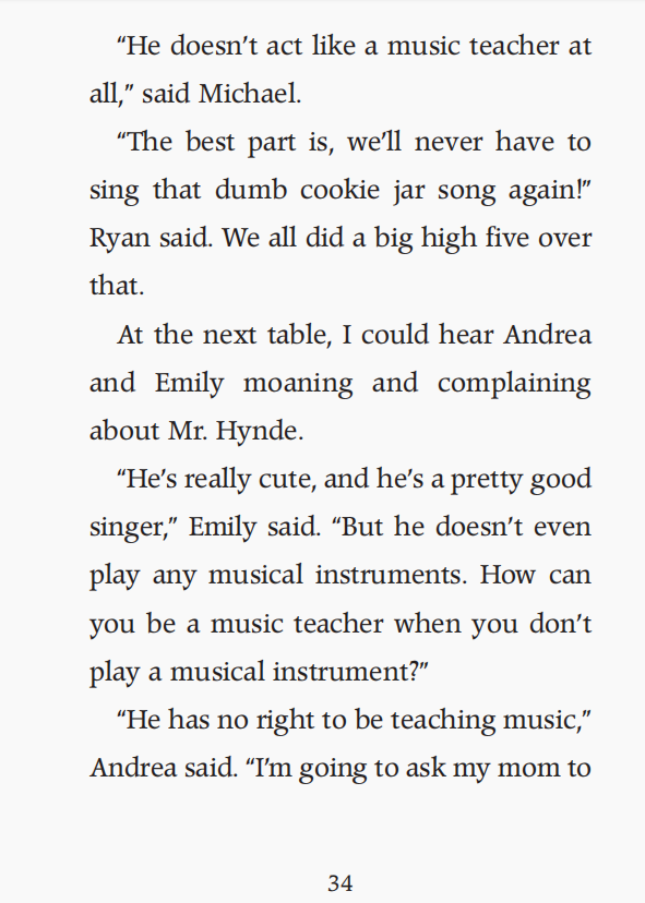 “他没有资格教音乐,”Andrea说,“我要让我妈妈跟Klutz校长谈谈。也许她能解雇Hynde先生。”