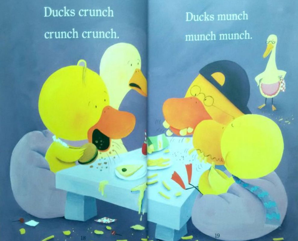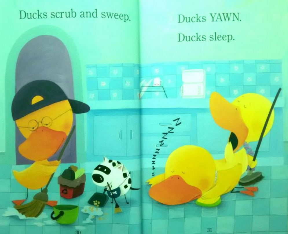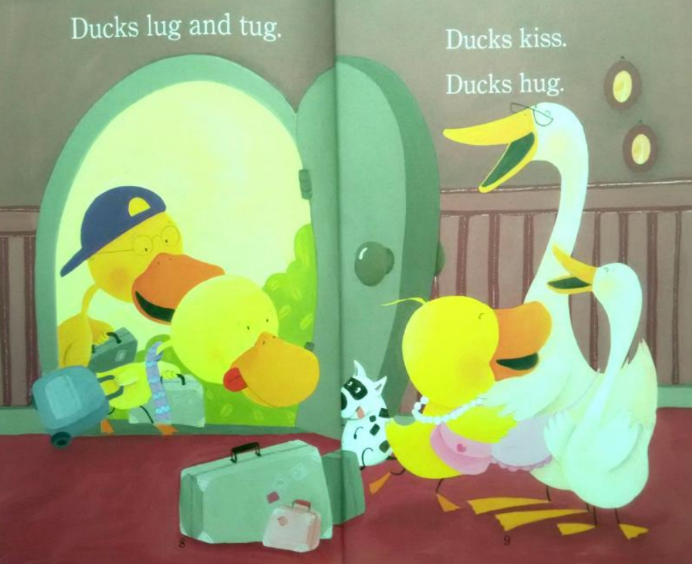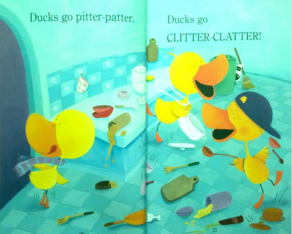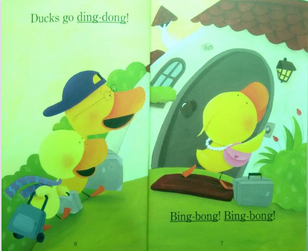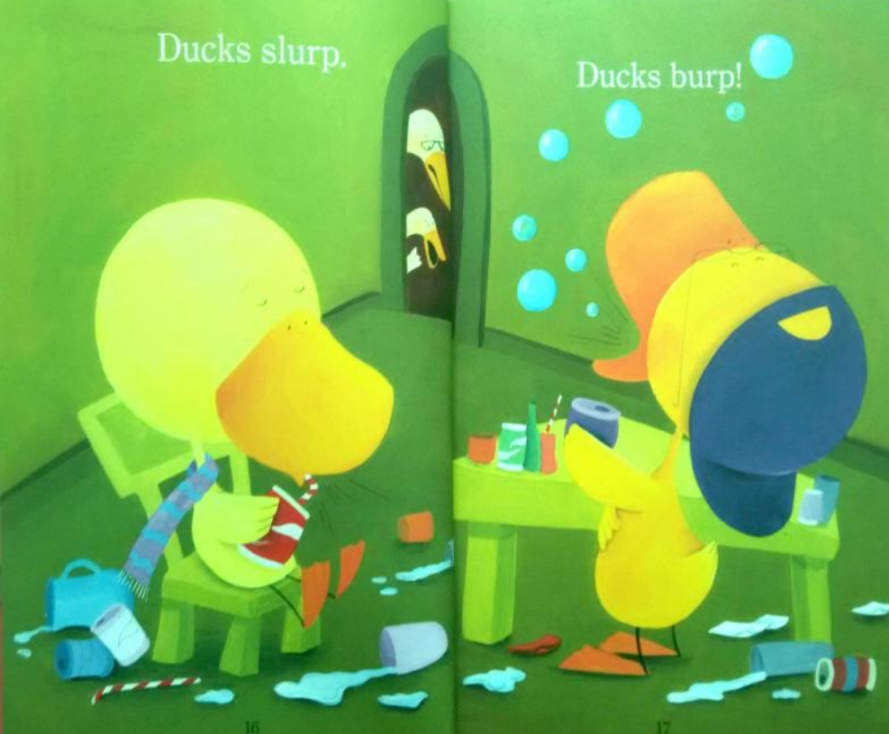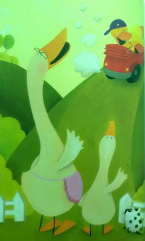 今天的绘本讲了三只鸭子一起开车去鹅妈妈家做客的故事。他们三个可不老实,在鹅妈妈家又吵又闹,打电话;看电视;吃东西;做东西.......把鹅妈妈家搞得一团乱,鹅妈妈生气了,三只鸭子也觉得不好意思了,最后他们把家里打扫干净,开心地离开了。