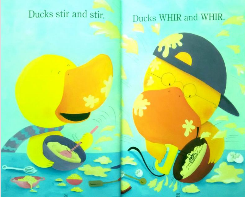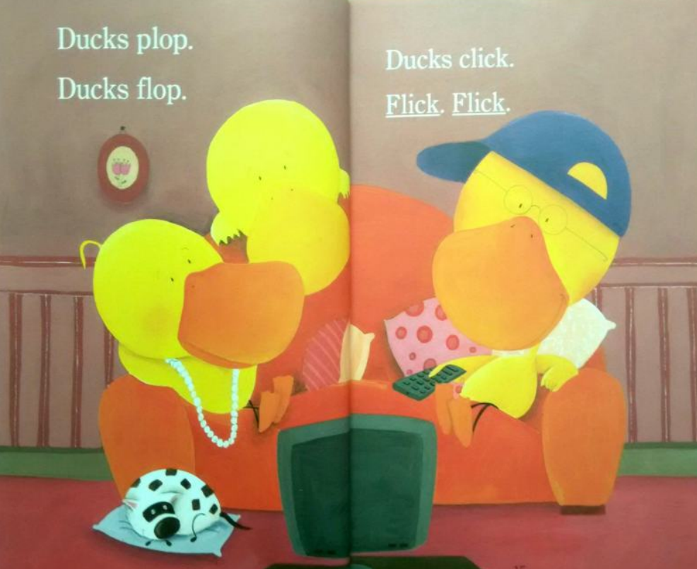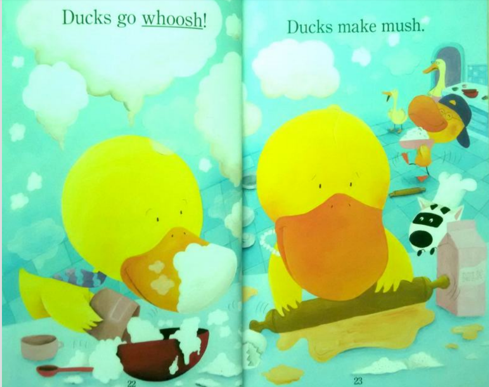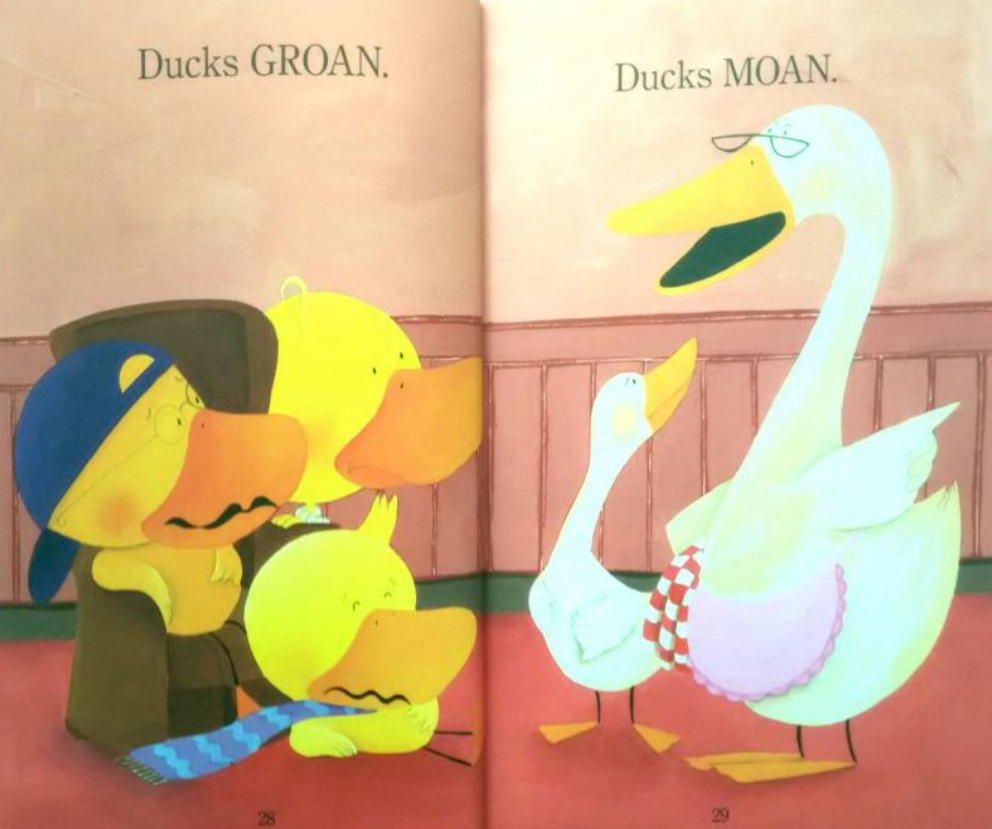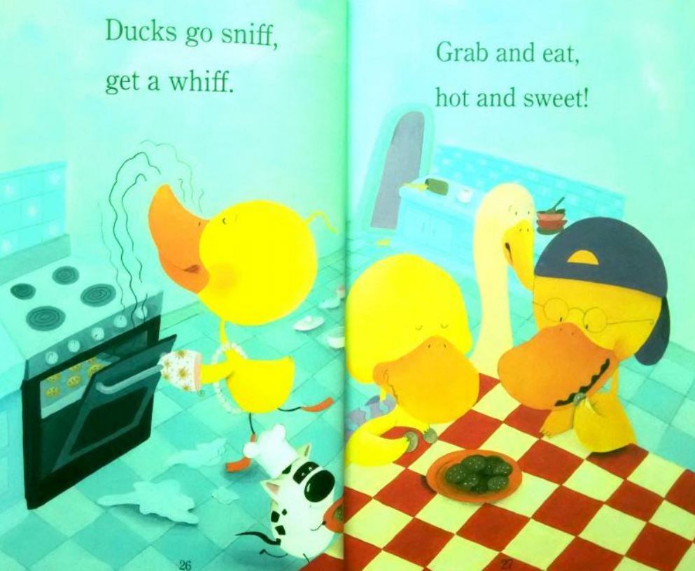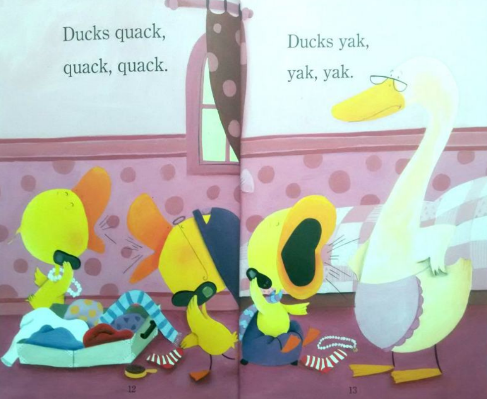 今天的绘本讲了三只鸭子一起开车去鹅妈妈家做客的故事。他们三个可不老实,在鹅妈妈家又吵又闹,打电话;看电视;吃东西;做东西.......把鹅妈妈家搞得一团乱,鹅妈妈生气了,三只鸭子也觉得不好意思了,最后他们把家里打扫干净,开心地离开了。