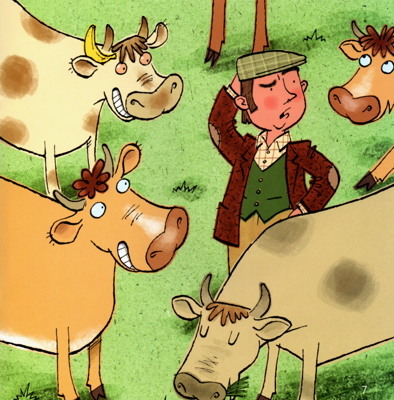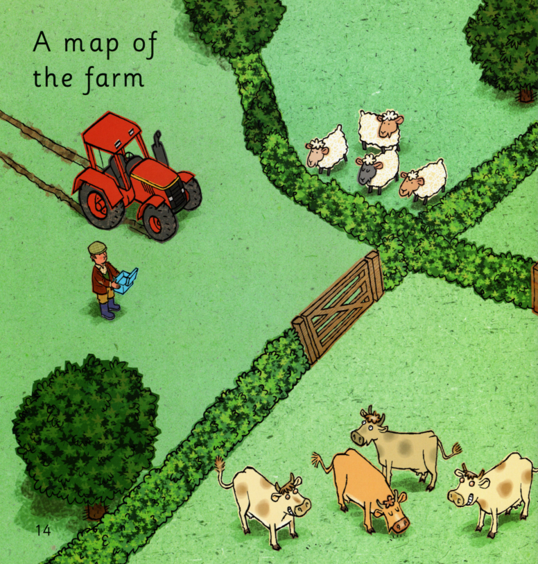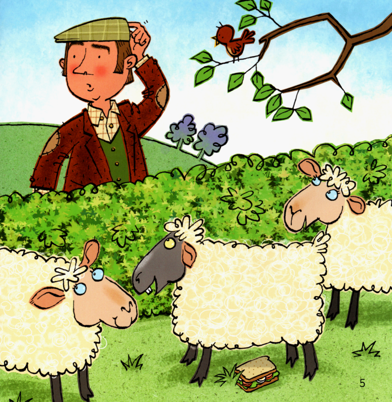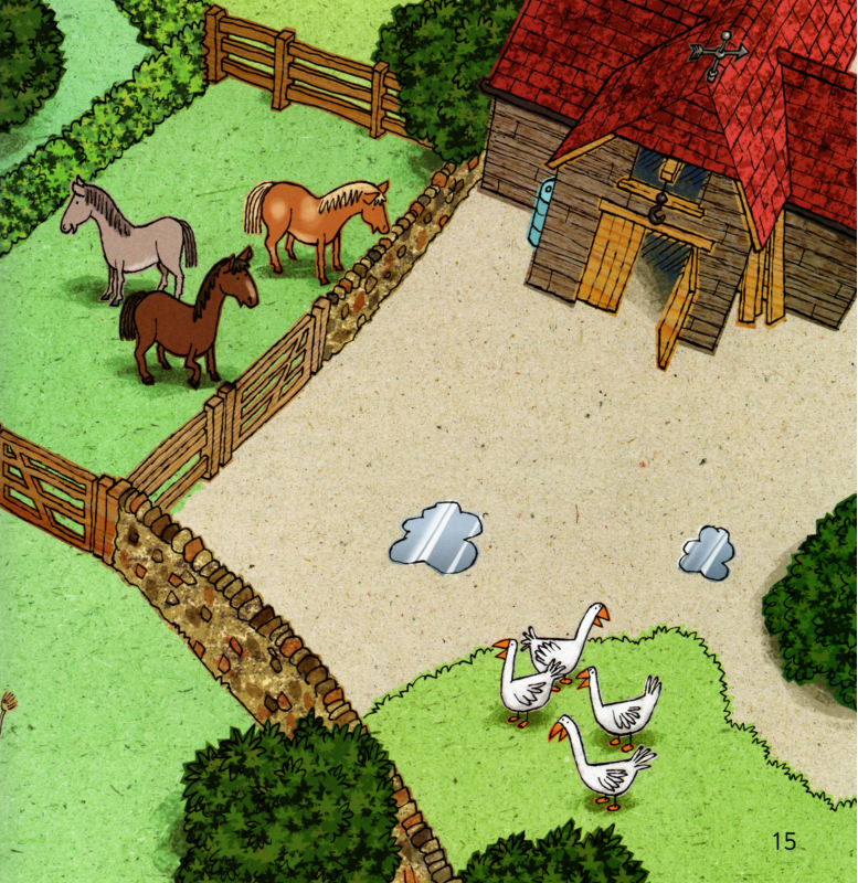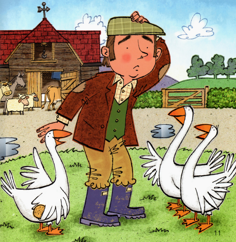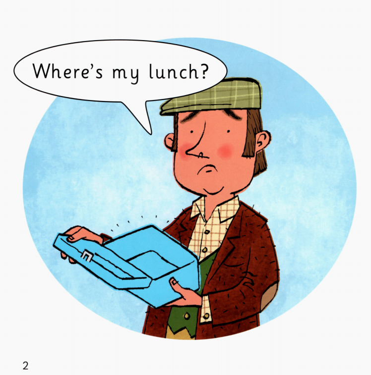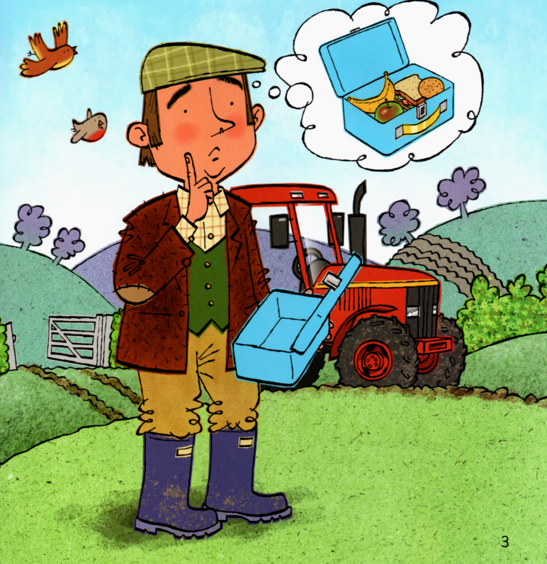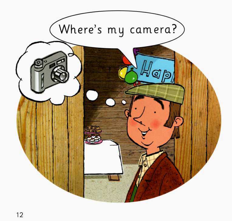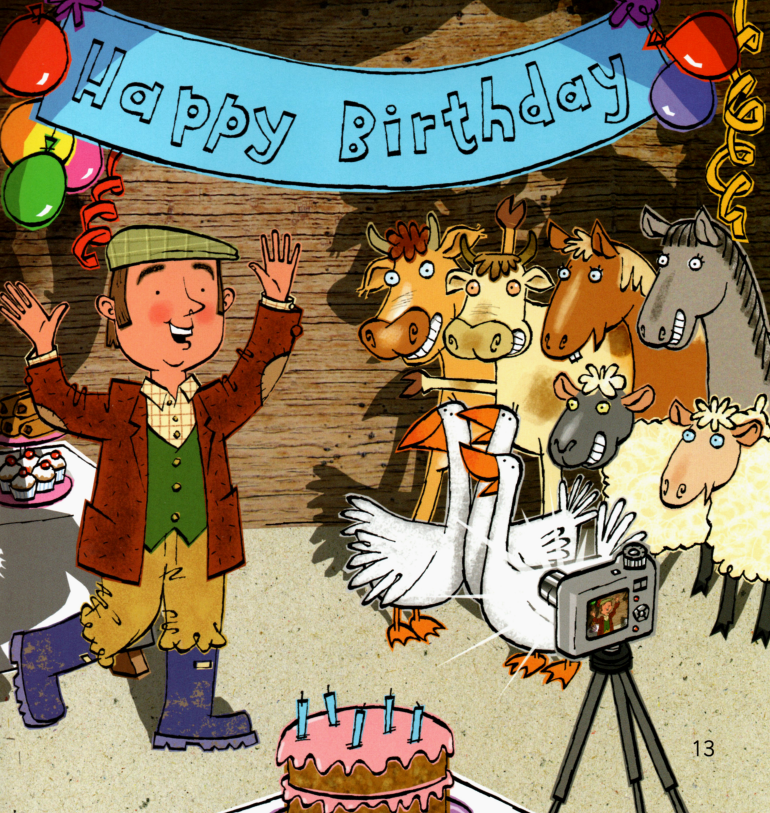 今天的绘本里有一位农夫,他盒子里的午餐不见了。里面本来有三明治、香蕉、苹果、饼干。除此之前,他的相机也不见了。他在农场里一路寻找,小朋友们,你们在图片中能不能找到这些东西呢?最后,他在农场房子里找到了他的相机。原来今天是他的生日,动物们为他准备了生日蛋糕,祝他生日快乐