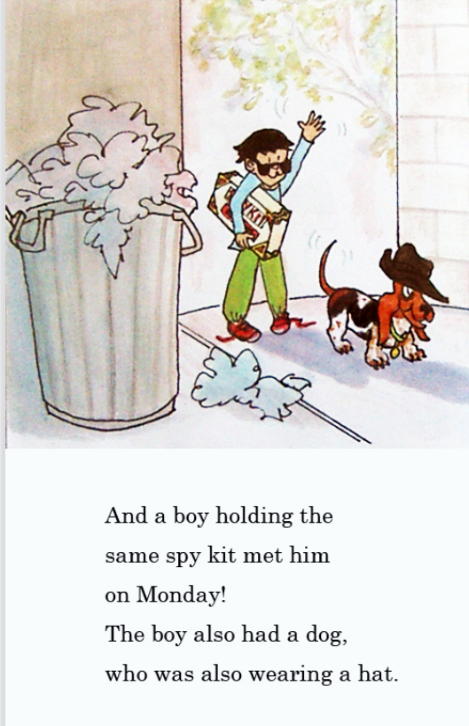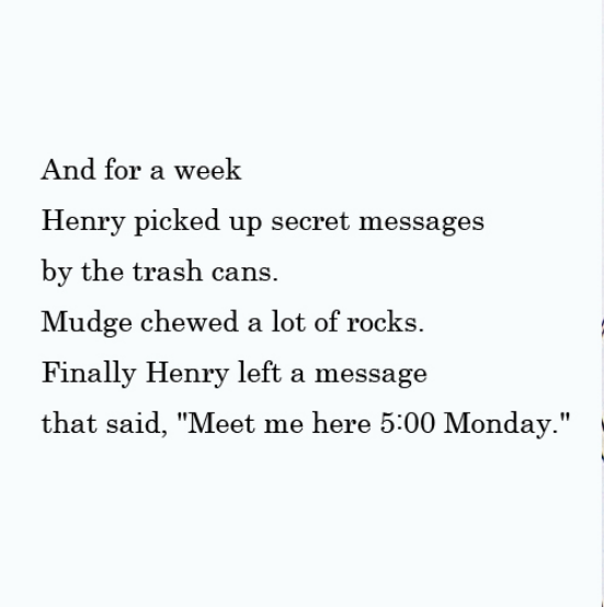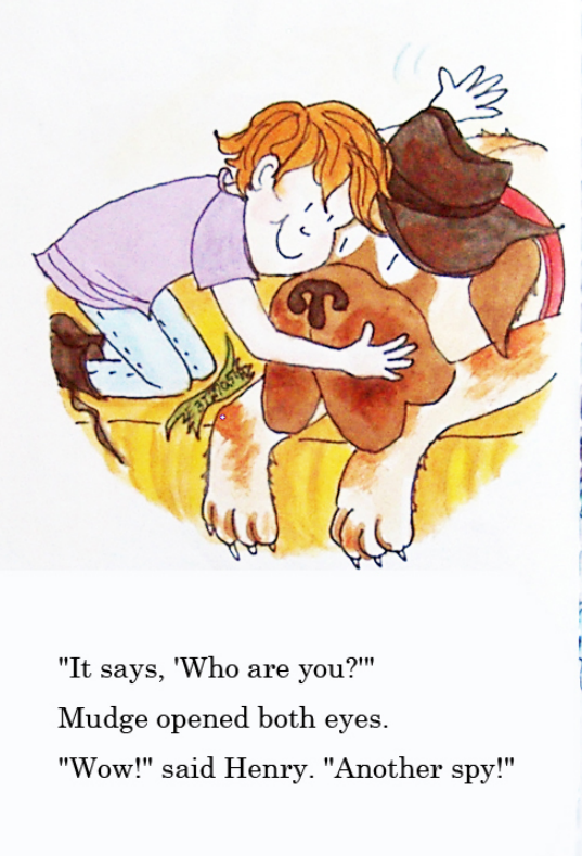 Henry把字条带回家,与他买的间谍装备里的密码卡对照,终于,他破解了字条上的内容,原来是问“你是谁?”Henry很兴奋,看来还有另一个和他一样的间谍爱好者。他在之后的一周时间里,不断地在垃圾桶旁留下字条,同时也收到字条。最后Henry约这个神秘人周一五点见面。一个同样有间谍装备,同样有一条狗的男孩如约而至。他们两人决定成立一个名为“破迷高手”的俱乐部,作为身份象征,口袋里还会装些饼干,而这正是Mudge最喜欢的