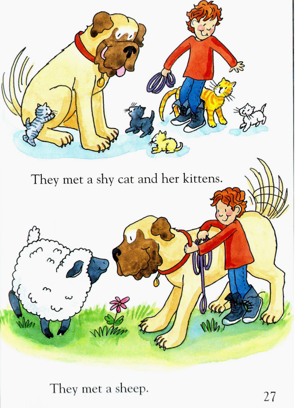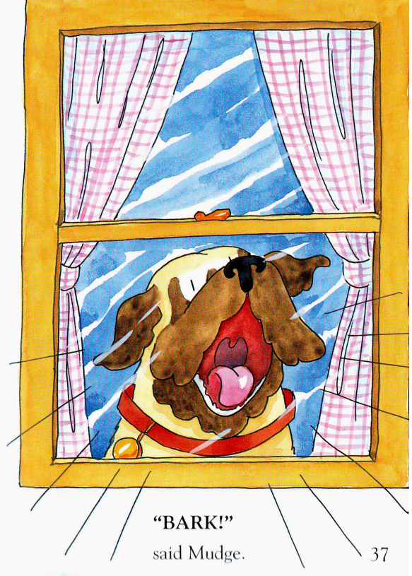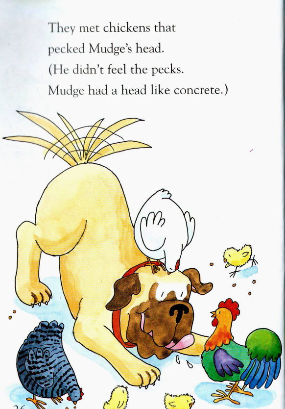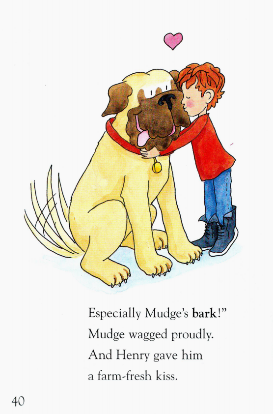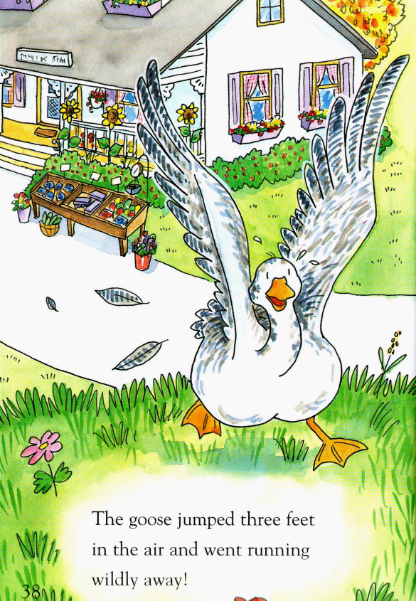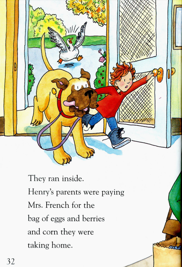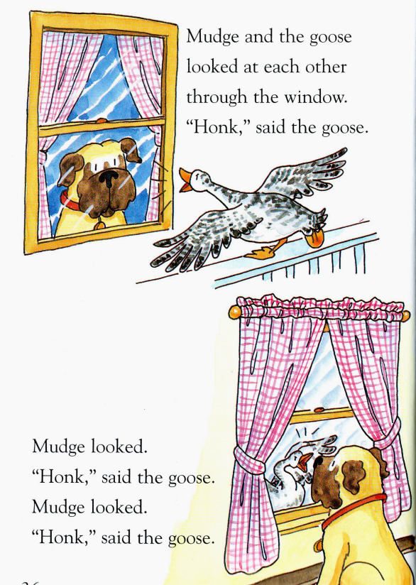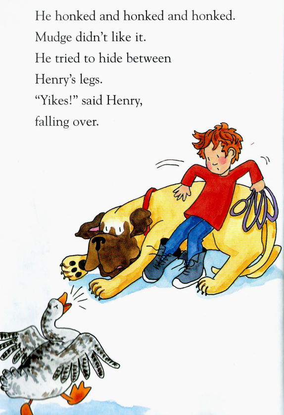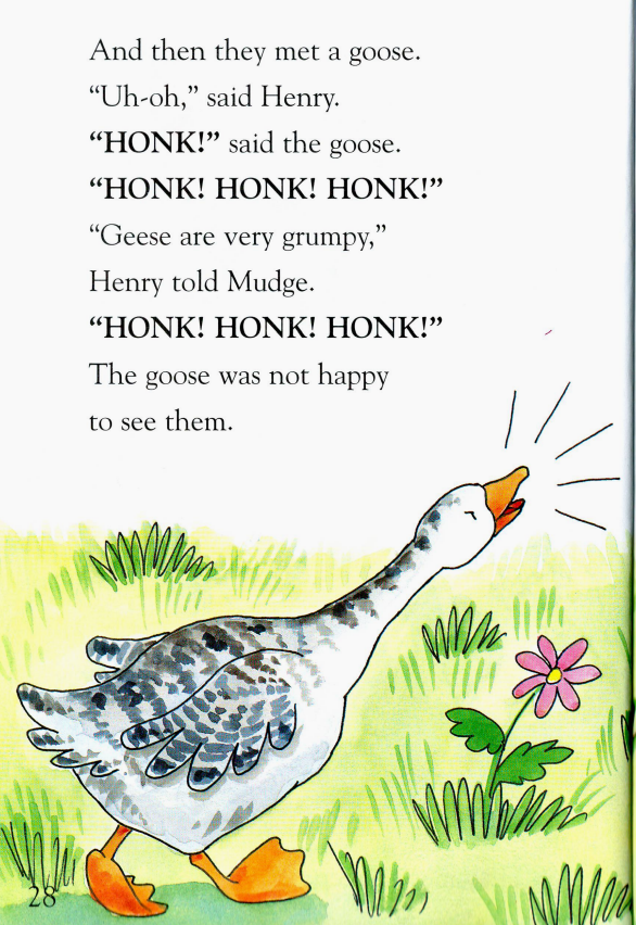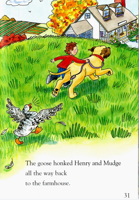 今天的故事就讲到了Henry和Mudge在农场里的所见所闻。他们见到了各种农场里的动物,比如:山羊,鸡群,猫妈妈和猫宝宝,绵羊等等。但给他们留下深刻印象的要算是鹅了。这只鹅好似不太欢迎Henry和Mudge,冲着他们不停地叫,并一直追赶着他们,直到Henry和Mudge跑回了French太太的农舍里。隔着窗户,这只鹅还在叫,Mudge看着他,最后也叫了一声,这一声音量格外大,把这只鹅吓跑了