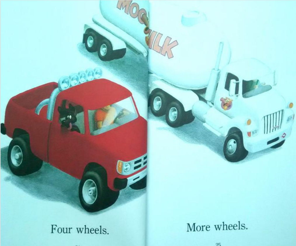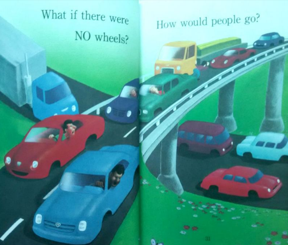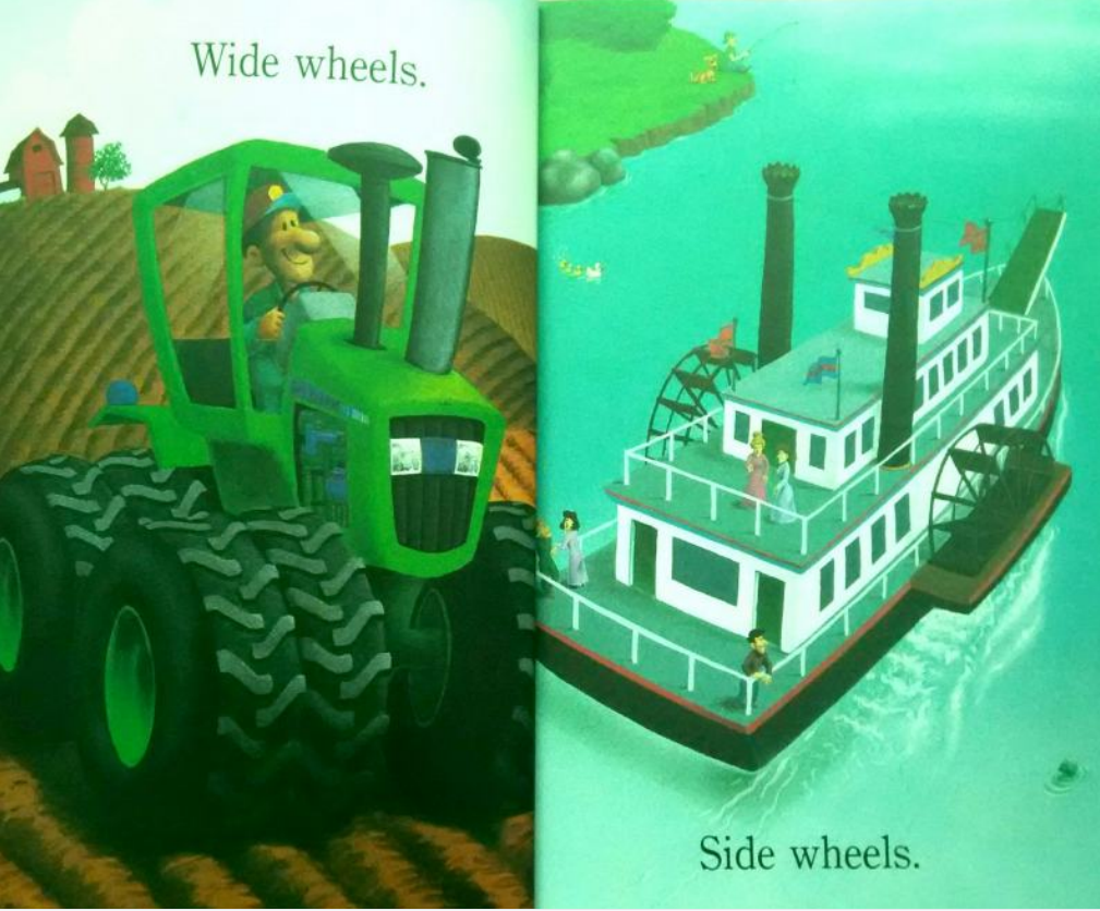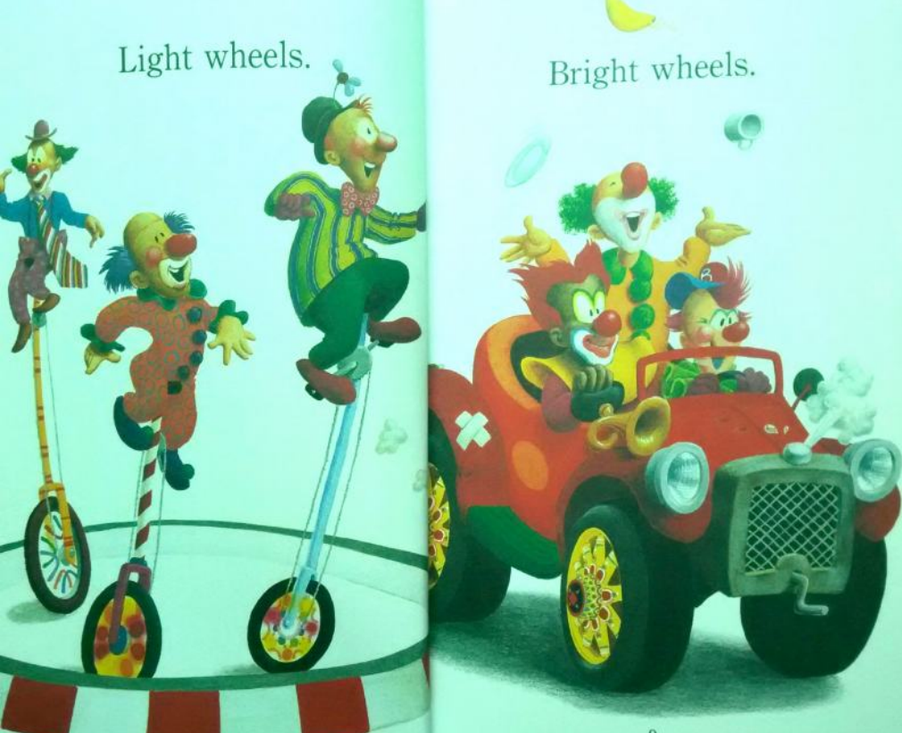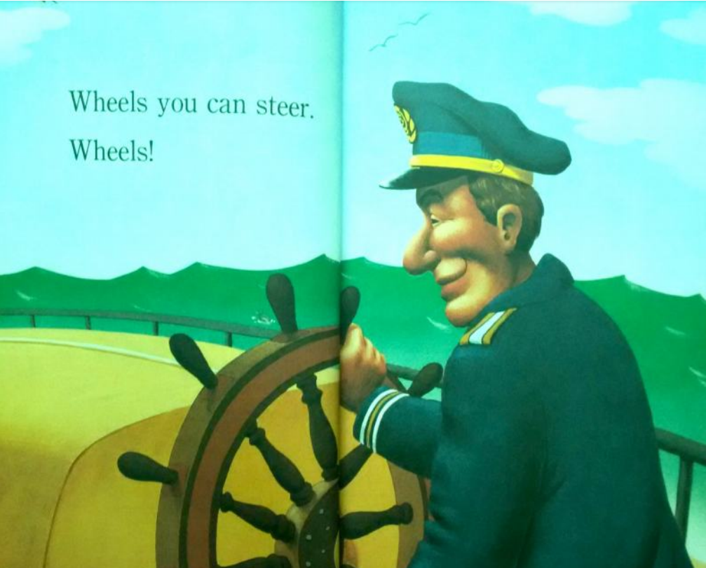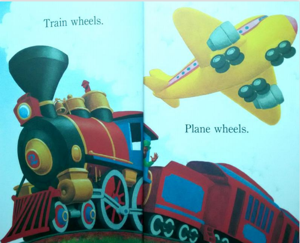 今天在绘本中,我们见到了各种各样的轮子,比如火车轮子、飞机轮子,轻便的轮子,鲜亮的轮子,宽的轮子、侧面的轮子,还有小朋友常坐的摩天轮等等。这本书可以帮助小朋友积累不少词汇,并对各种轮子有一个初步认识。