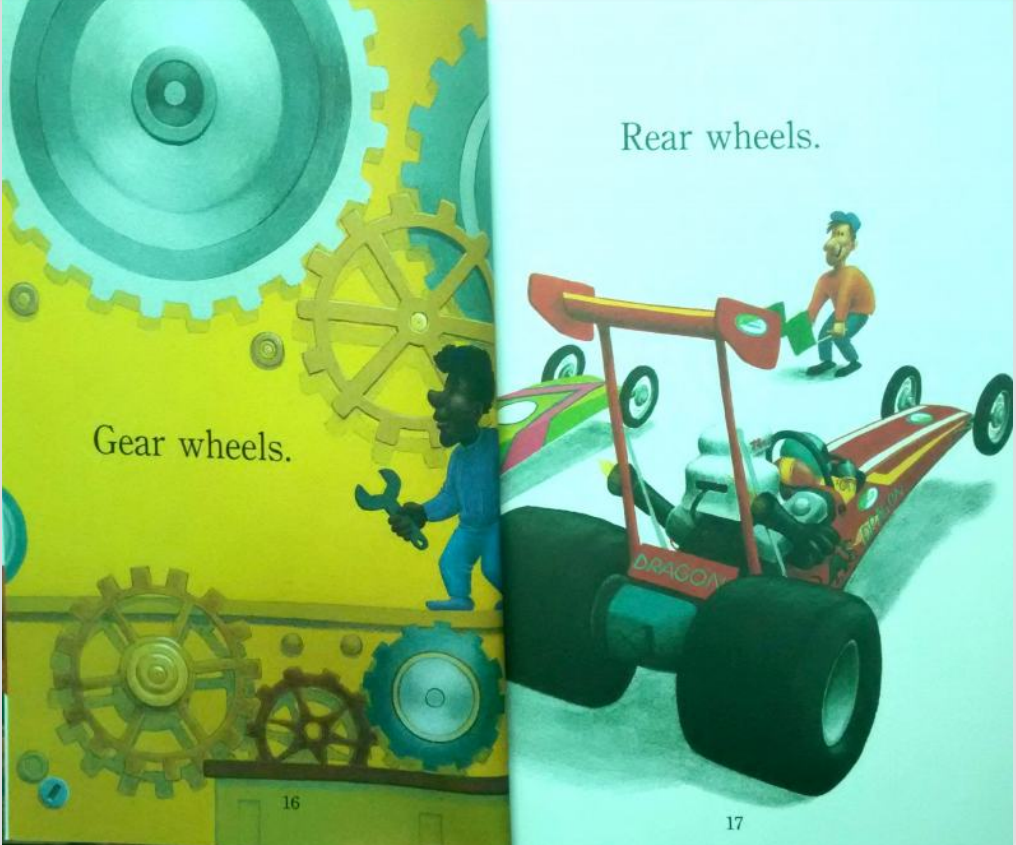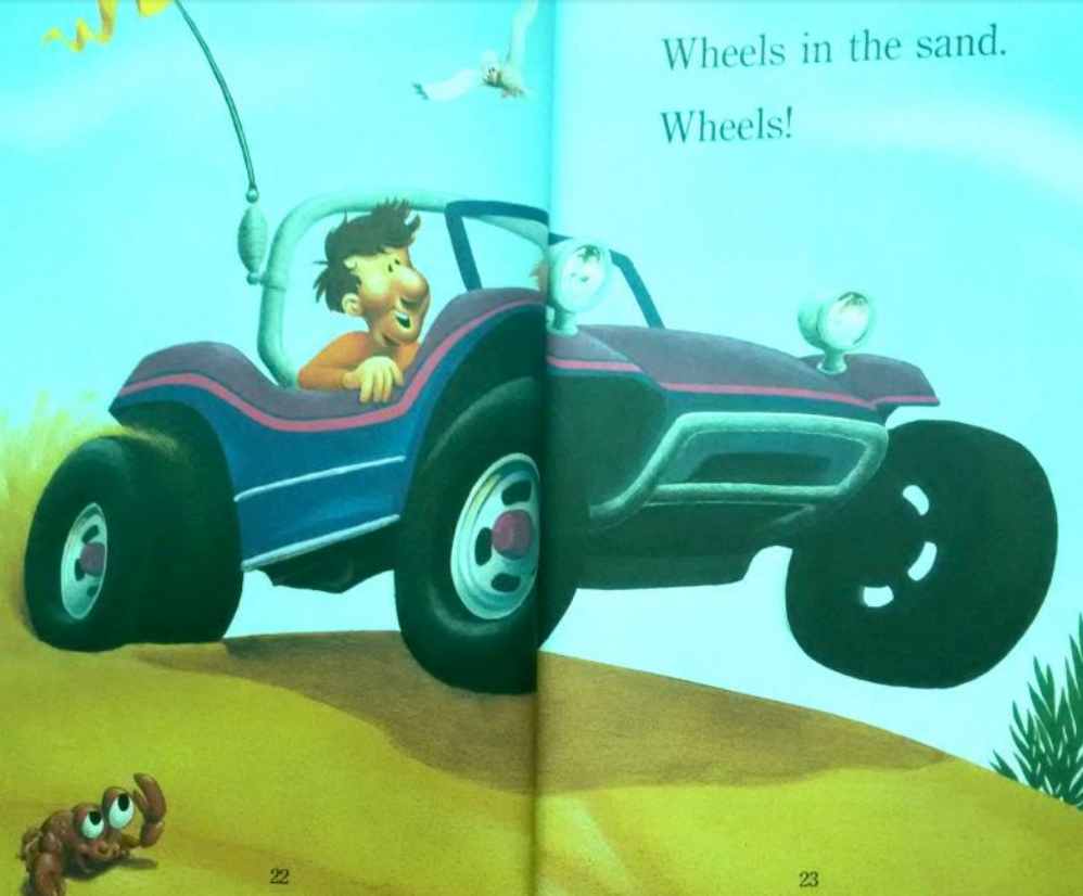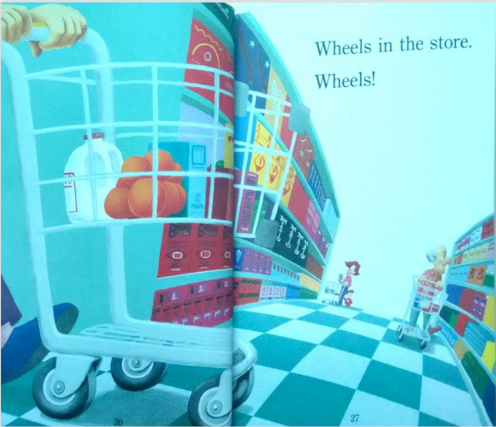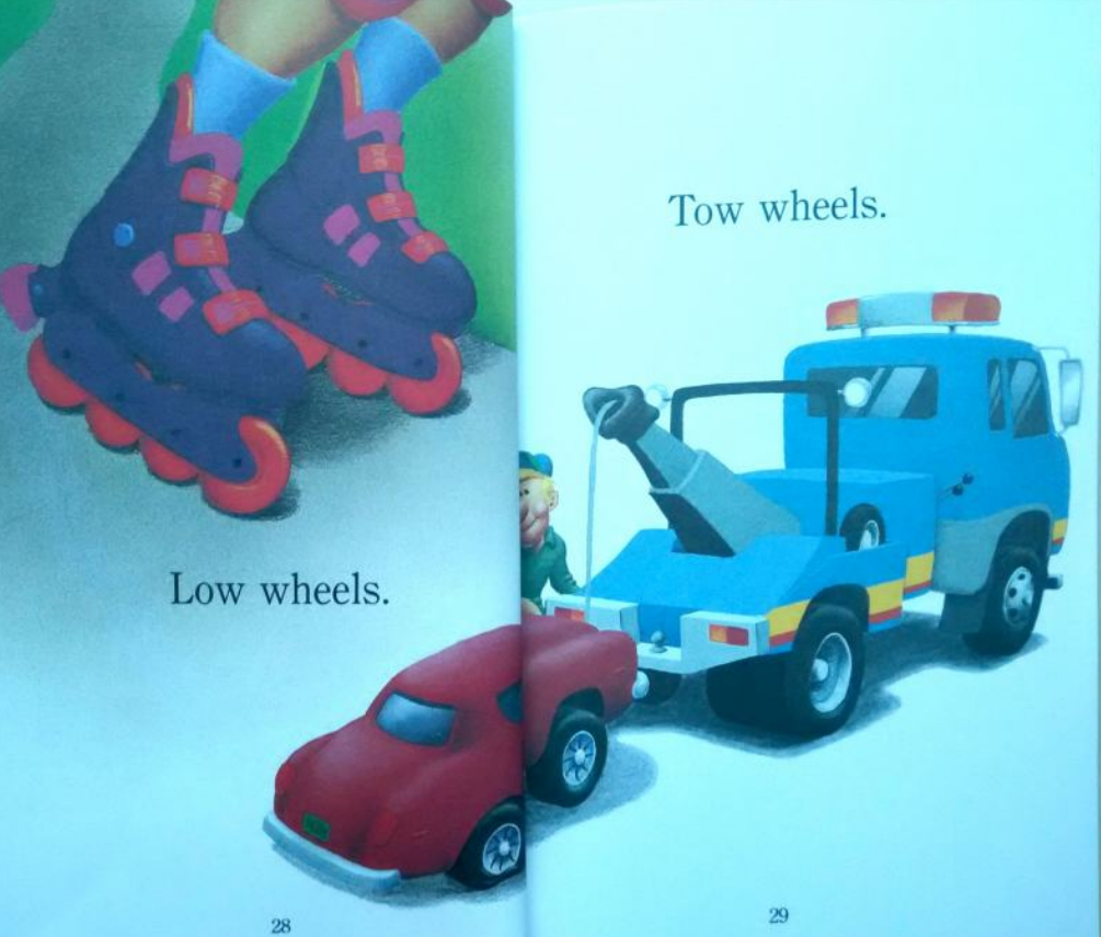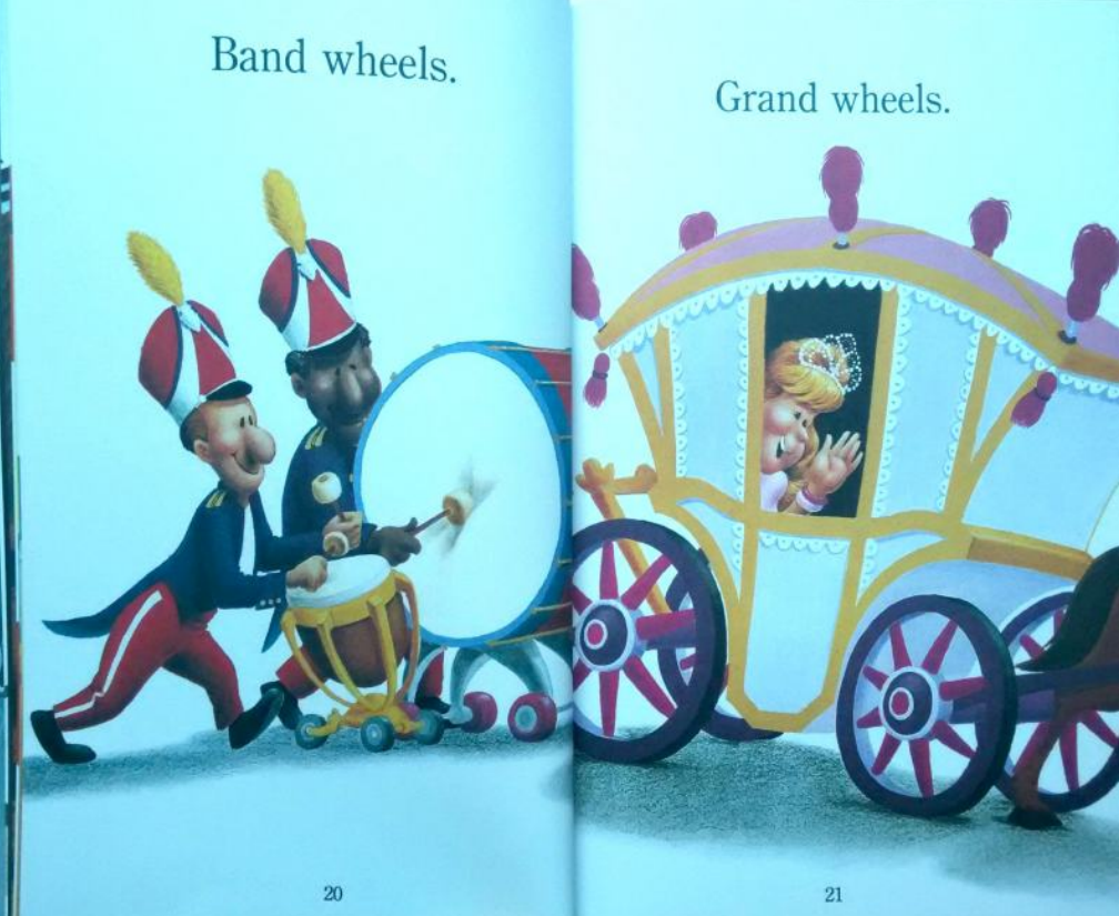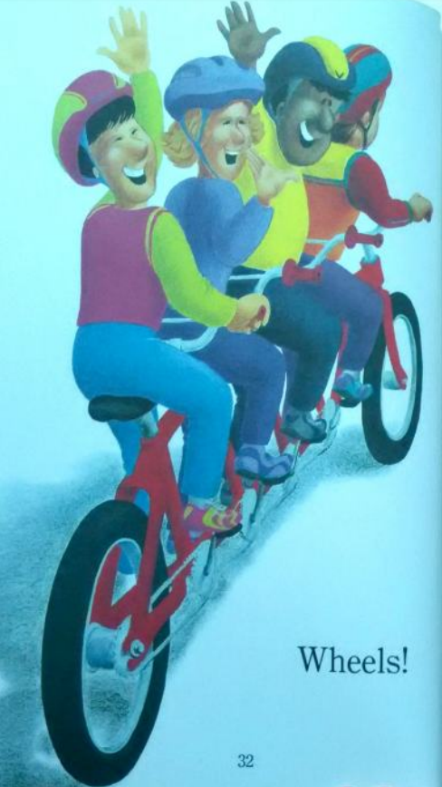 今天在绘本中,我们见到了各种各样的轮子,比如火车轮子、飞机轮子,轻便的轮子,鲜亮的轮子,宽的轮子、侧面的轮子,还有小朋友常坐的摩天轮等等。这本书可以帮助小朋友积累不少词汇,并对各种轮子有一个初步认识。