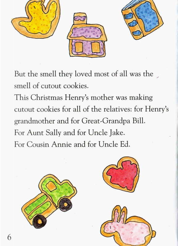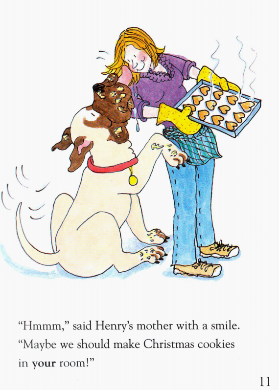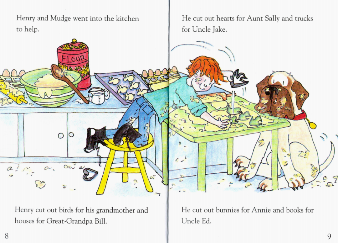 Henry和Mudge非常喜欢圣诞节。他们喜欢各种圣诞节的味道,而最喜欢的味道就是图案饼干的味道。今年圣诞节,Henry妈妈要为亲戚们做很多饼干,等他们来家里吃完圣诞早餐后,可以把饼干带回家。Henry和Mudge也到厨房来帮忙,Henry负责用模具压出各种图案的饼干,而Mudge则负责舔干净厨房
