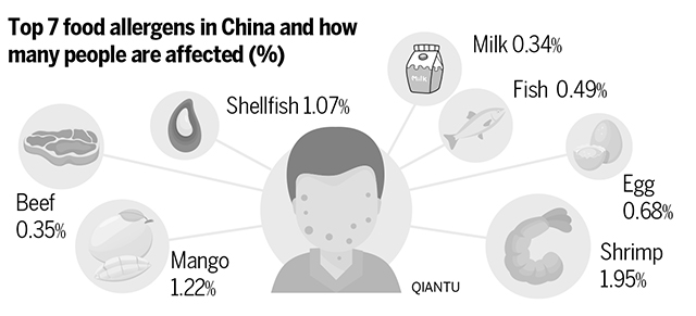 A new study showed that food allergies affected (影响) 8 percent of Chinese people from 2009 to 2018. The number was 5 percent from 1999 to 2008. Food allergies are increasing among Chinese people!