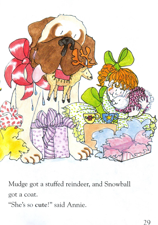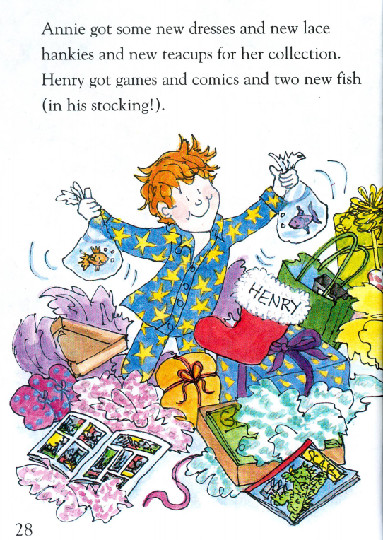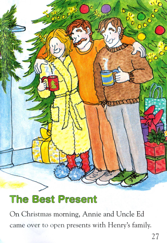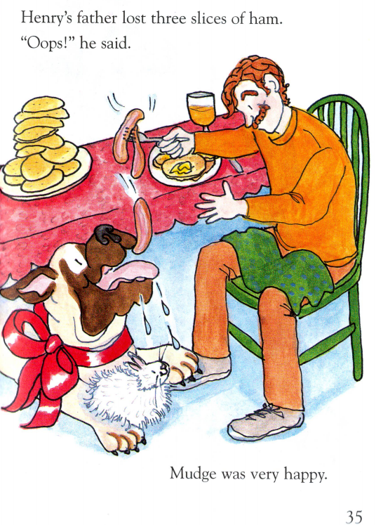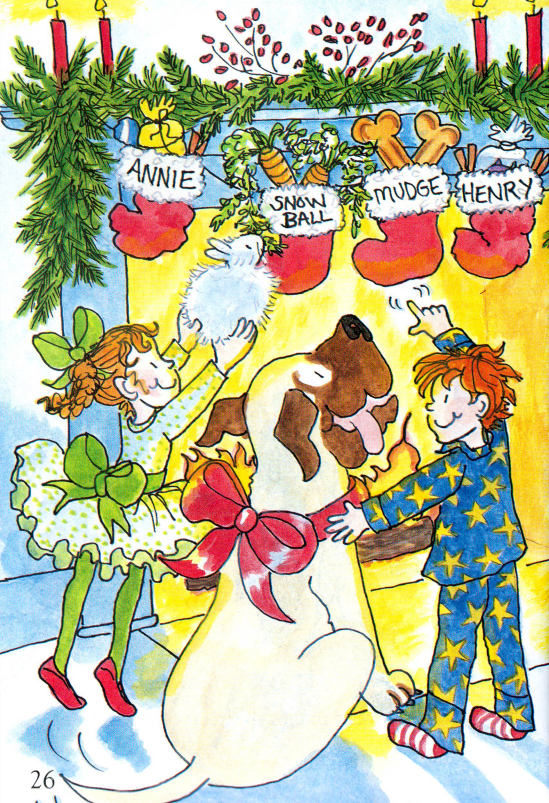 圣诞节终于来到了。一大早,Annie和Ed叔叔来到Henry家,一起拆礼物。Annie得到了新裙子、新蕾丝手帕和新茶杯。Henry得到了游戏、漫画和两条鱼(在他的(圣诞)长袜里)。Mudge得到的是毛绒驯鹿,Snowball得到的是一件外套。之后,所有的亲戚都来吃早餐了,屋里弥漫着煎饼的香味。亲戚们会一边吃饭,一边拿好吃的喂餐桌下的Mudge和Snowball。早餐过后,亲戚们带着圣诞饼干回家了。Henry帮着爸爸妈妈收拾厨房,之后一家人出去散步,并且给小动物们留下了一些吃的东西。回到家,Henry搂着Mudge,告诉他,“你仍然是我最好的礼物!” Mudge不停摇着尾巴