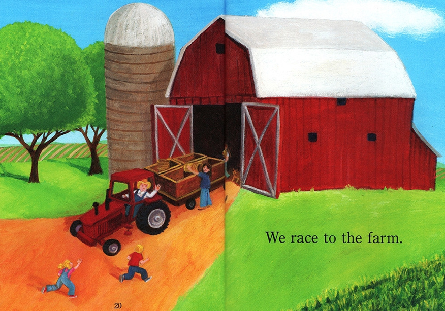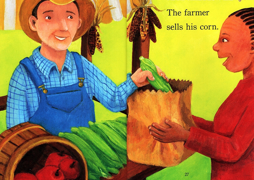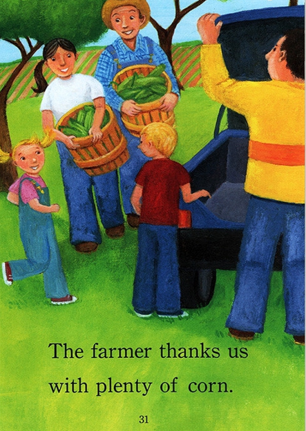 今天的绘本带我们去了农场。在农场里,我们看到了农民犁地、播种、施肥、浇水、采摘和收获。最后孩子们帮助农民一起售卖玉米,农民为了表示感谢,送给孩子们很多玉米,孩子一家也用一顿丰盛的晚餐作为感谢!