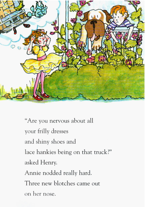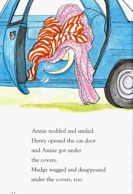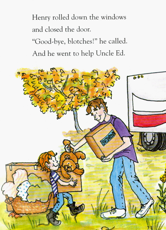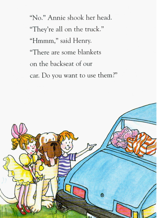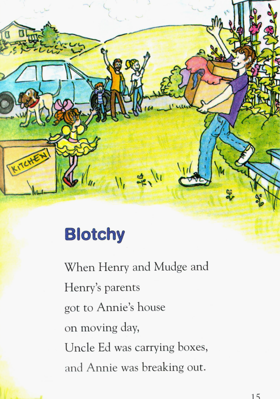 在搬家这天,Henry、Mudge和Henry父母都来帮忙了。不过,Annie表妹遇到了点小麻烦。因为她要离开她的朋友们,离开她的学校,还有暂时离开她那些被装上卡车的漂亮裙子、鞋子、手帕,所以她感到有些紧张,而她一紧张,就会出疹子,长红斑。Henry了解情况后,为Annie出了一个主意,让她躲到毯子下面。