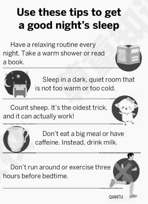 Do you play with your phone before bedtime? You may want to read a book instead. According to a US study, looking at screens at night can cause us to sleep poorly.In the evening, our bodies make melatonin (褪黑素). Melatonin helps us feel sleepy and relaxed. It’s an important part of our sleep cycle (周期). Our electronic screens stop that cycle from working normally (正常地).Why? Phones, computers and TVs make blue light. Blue light stops our bodies from making melatonin. Even just a little bit of blue light can have an effect (影响). Eight minutes of blue light can keep your brain (大脑) “awake” for another hour, according to the study. Even if you fall asleep, you may have lots of dreams. Your brain won’t have a good rest.It’s even worse if you play an exciting game before bed. Games make our hearts beat faster, so we have a harder time falling asleep. Then, when we fall asleep, we don’t get enough “deep sleep”.