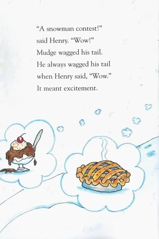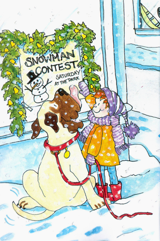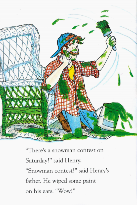 在一月的一个下雪天,Henry和Mudge走在大街上。这时,Henry在一个橱窗里发现了一个告示,上面写道:周六在公园将进行一个雪人比赛。Henry看到后很兴奋,Mudge看到Henry兴奋,他也兴奋地摇着尾巴。Henry他们马上跑回家告诉了爸爸。爸爸正在地下室给椅子刷油漆。Henry问爸爸是否可以参加这个雪人比赛,爸爸很爽快地答应了......