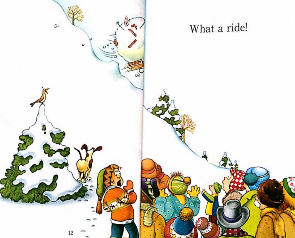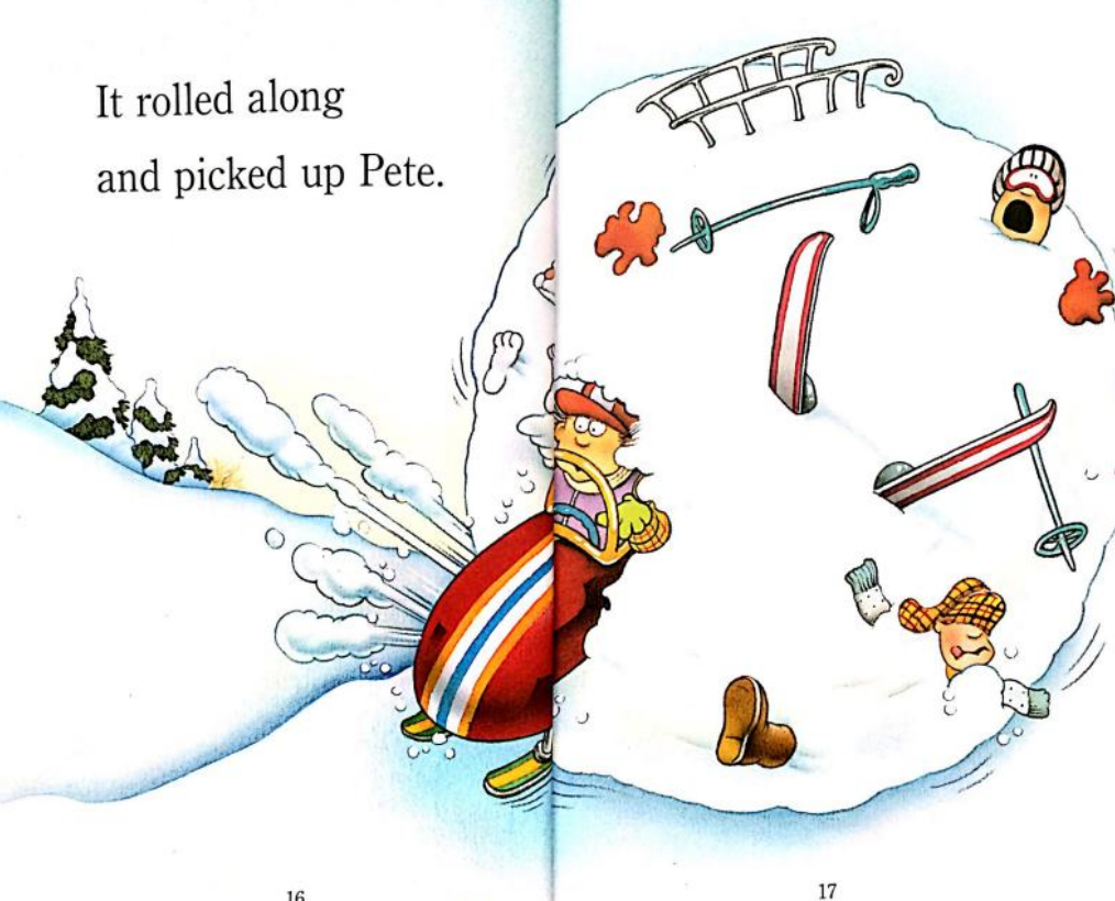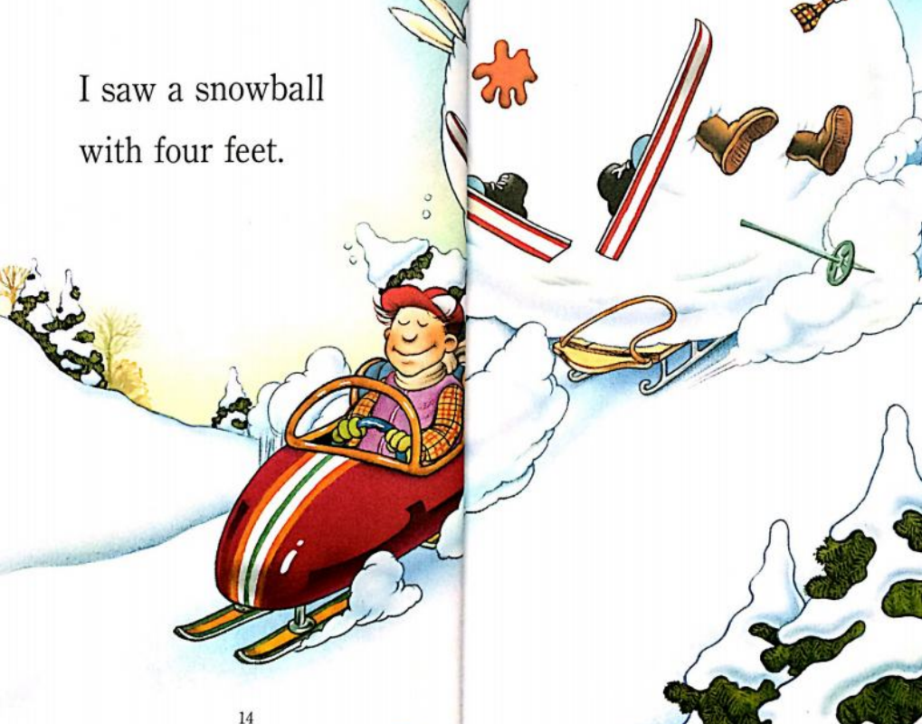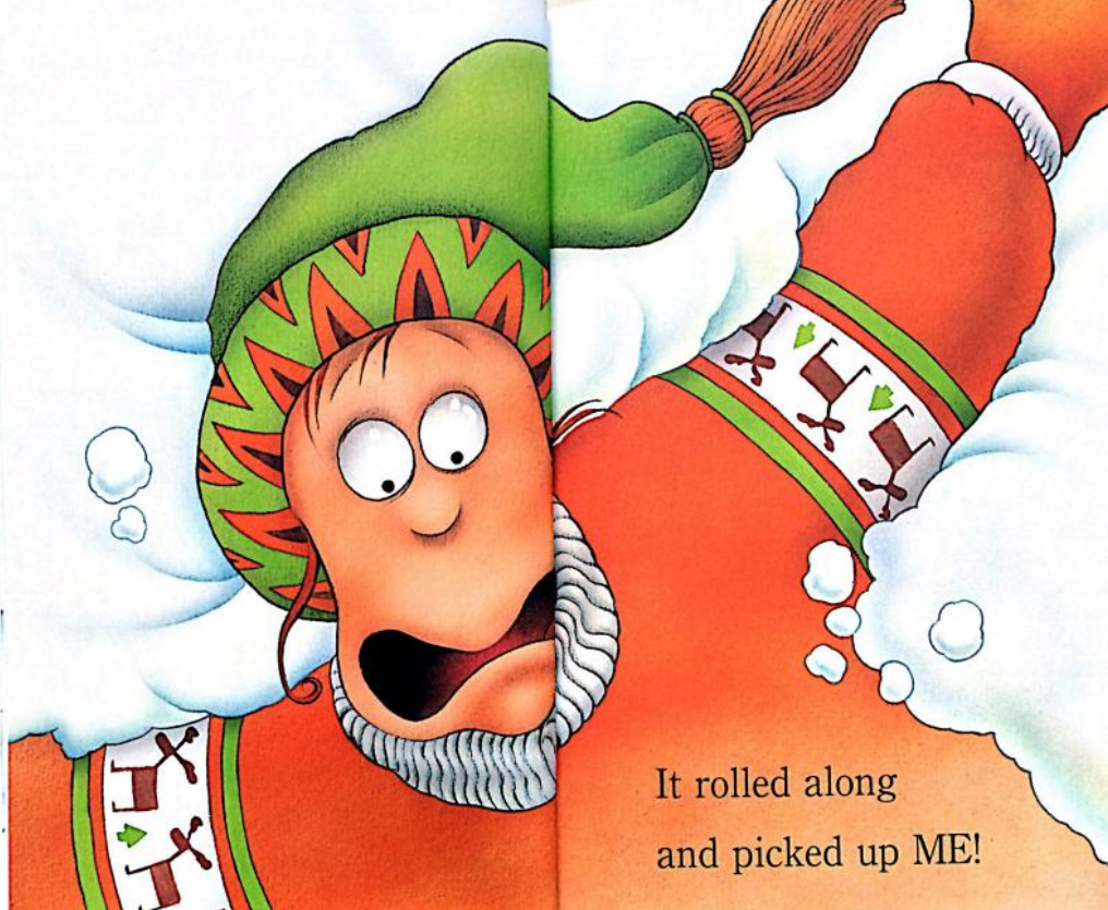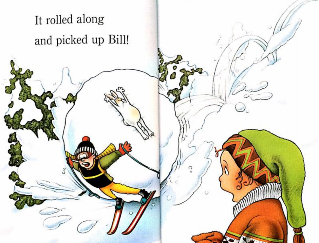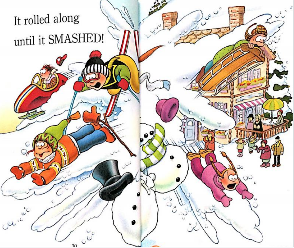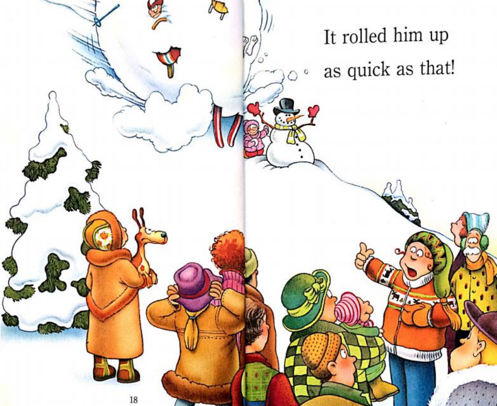 今天的绘本,讲了一个搞怪故事:一个巨大的雪球从山上滚下来,它一边滚,一边把沿途正在玩耍的小朋友们都一起滚进了大雪球里,直到最后滚到山下破碎才结束,这真是一次惊险刺激的旅程啊!