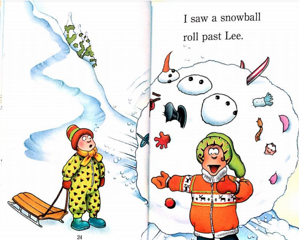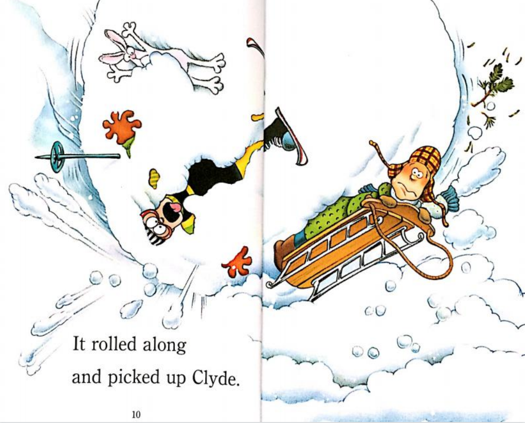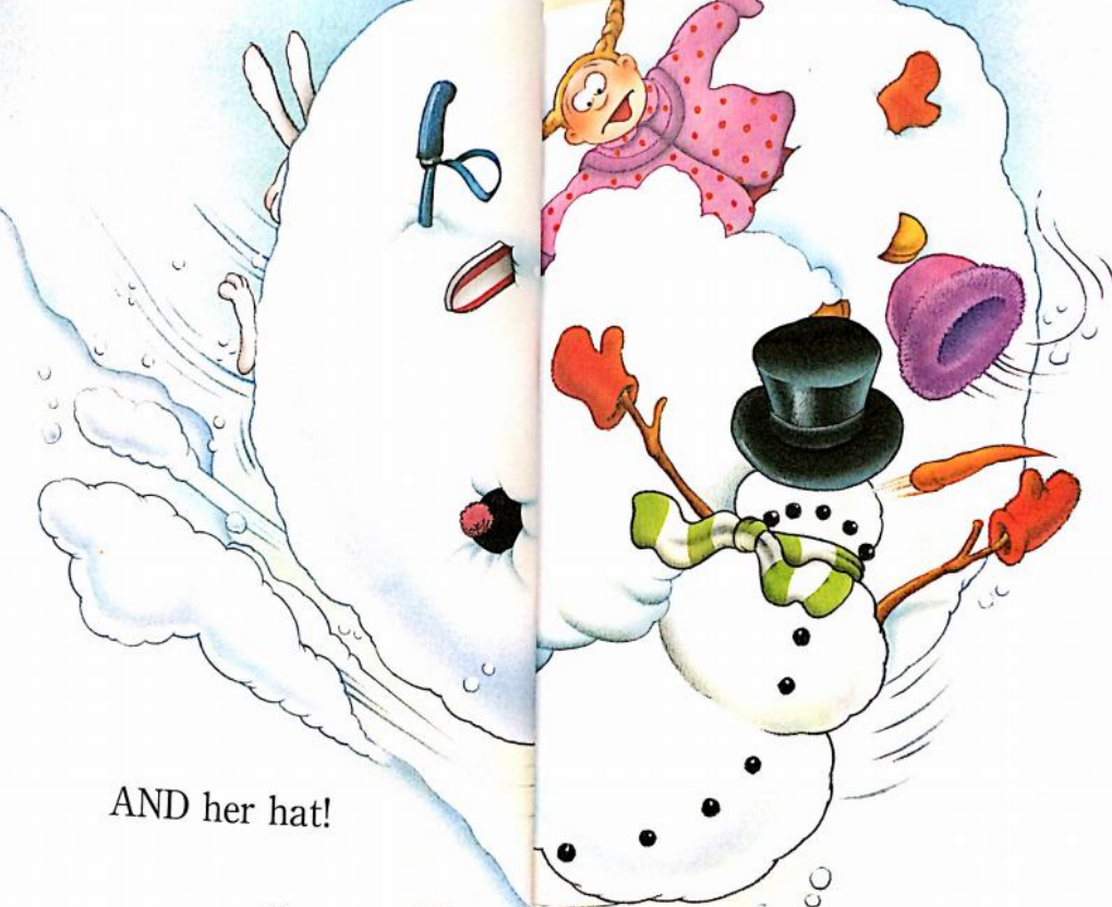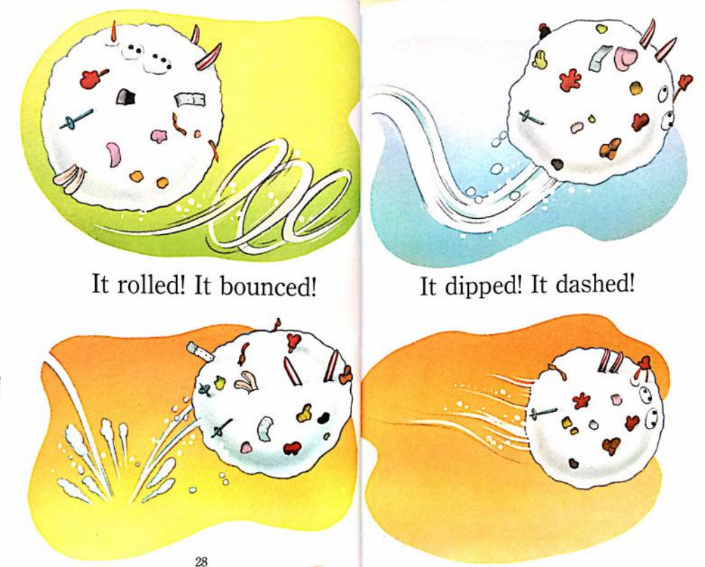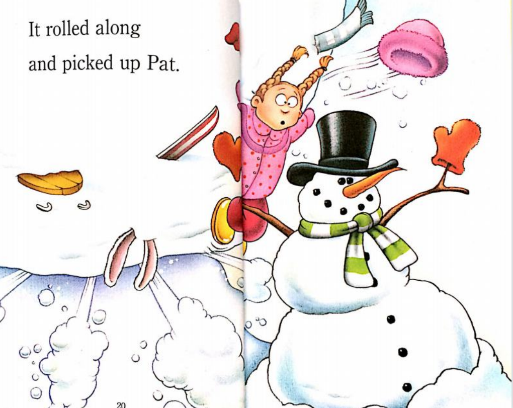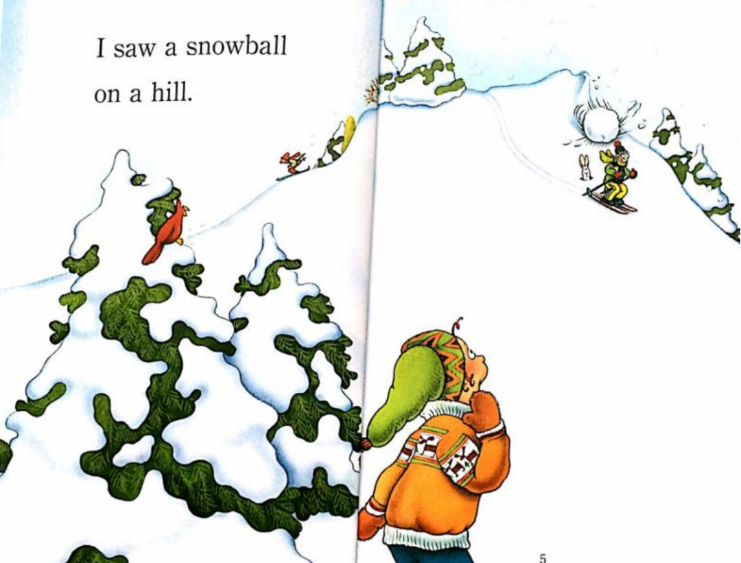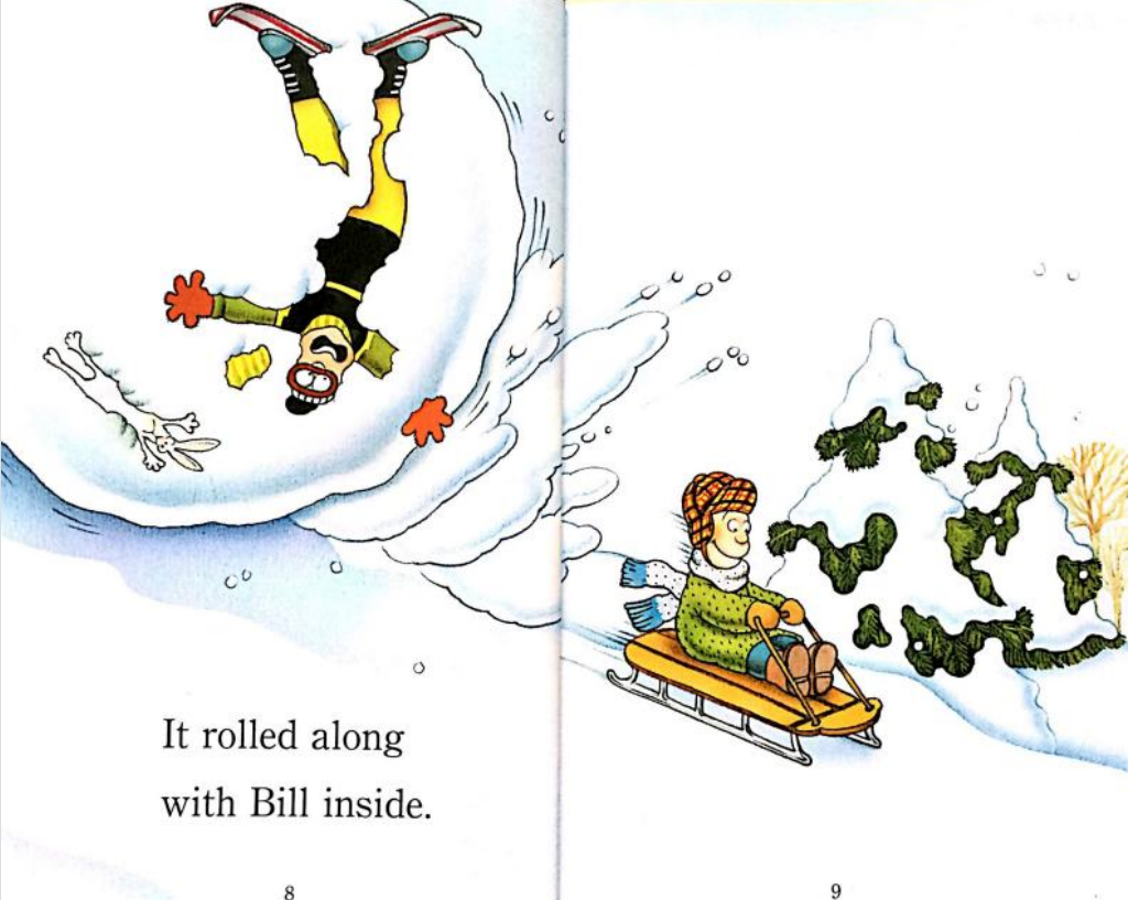 今天的绘本,讲了一个搞怪故事:一个巨大的雪球从山上滚下来,它一边滚,一边把沿途正在玩耍的小朋友们都一起滚进了大雪球里,直到最后滚到山下破碎才结束,这真是一次惊险刺激的旅程啊!