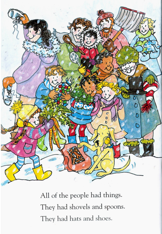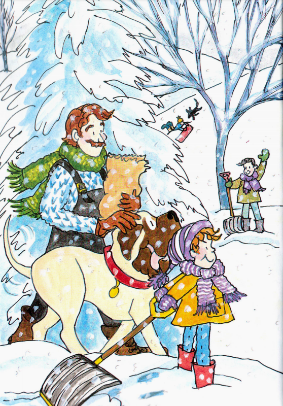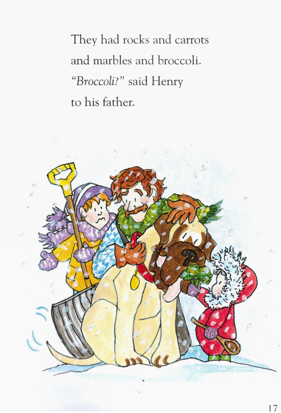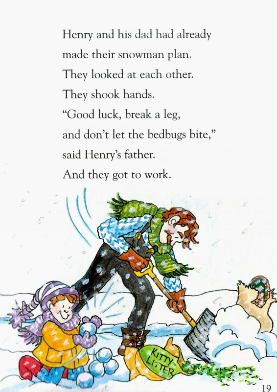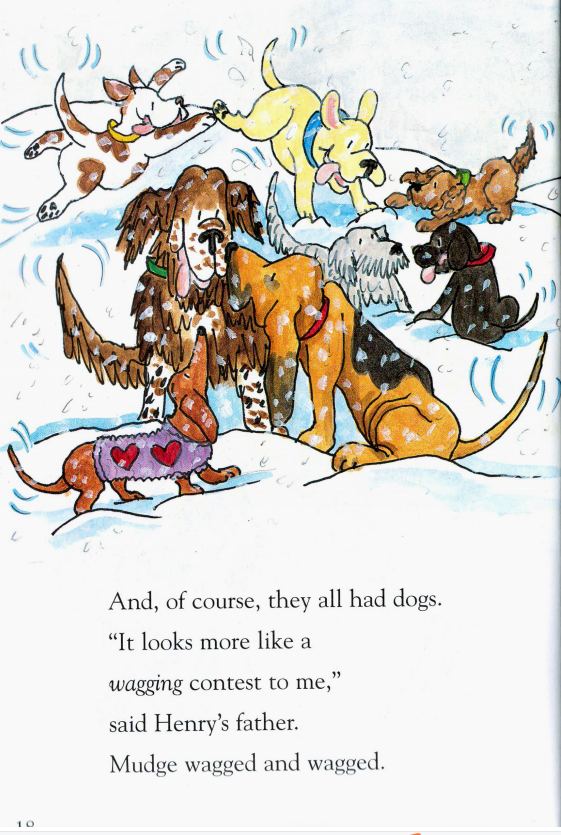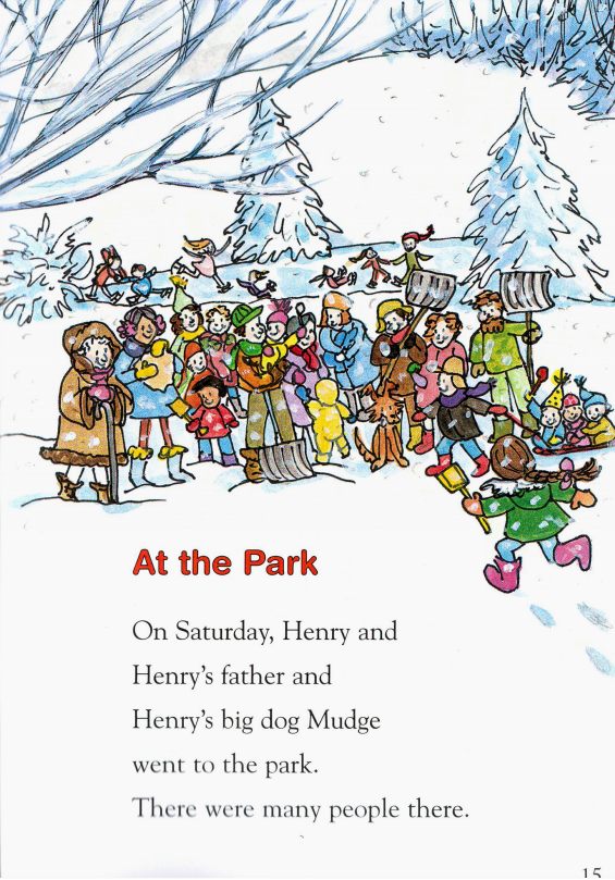 到了周六雪人比赛的日子。Henry,Henry爸爸和Mudge一起来到了公园里。已经有很多人在那里了,真热闹!大家都带着堆雪人用的各种物品:铲子,勺子,帽子,鞋子,石头,胡萝卜等等,除此之外,他们也都带着自家的狗一起,Henry爸爸觉得这倒更像是一场狗摇尾巴比赛
