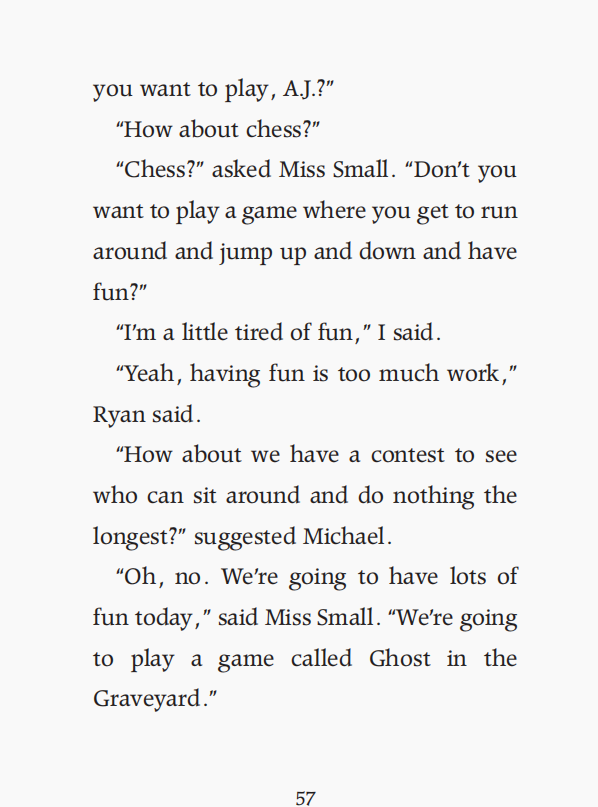 “哦,不。我们今天要好好玩,”Small小姐说,“我们今天要玩一个游戏,叫墓地里的鬼魂。”