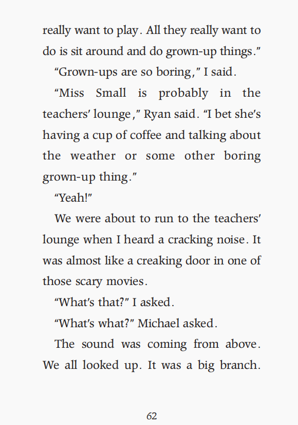 我们正要跑去教师休息室,我听到了嘎吱声。它几乎就像那些恐怖电影里嘎吱的门声。