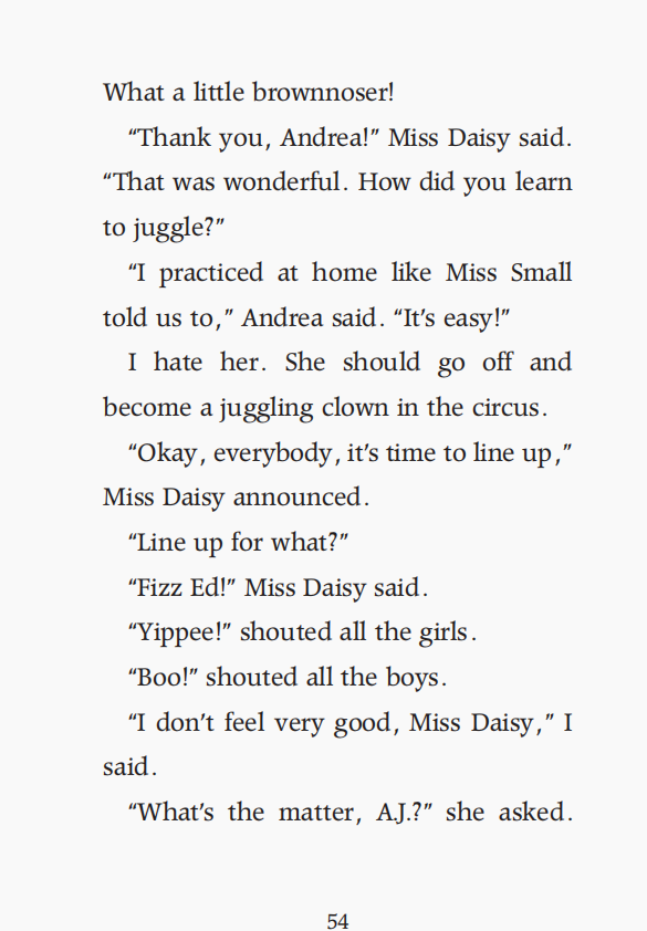 今天又有体育课了。A.J.想借故身体不舒服不去上课,但他的话说得语无伦次,Daisy小姐识破了他的小把戏,告诉他,上完体育课他就能好起来了