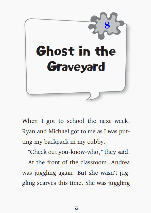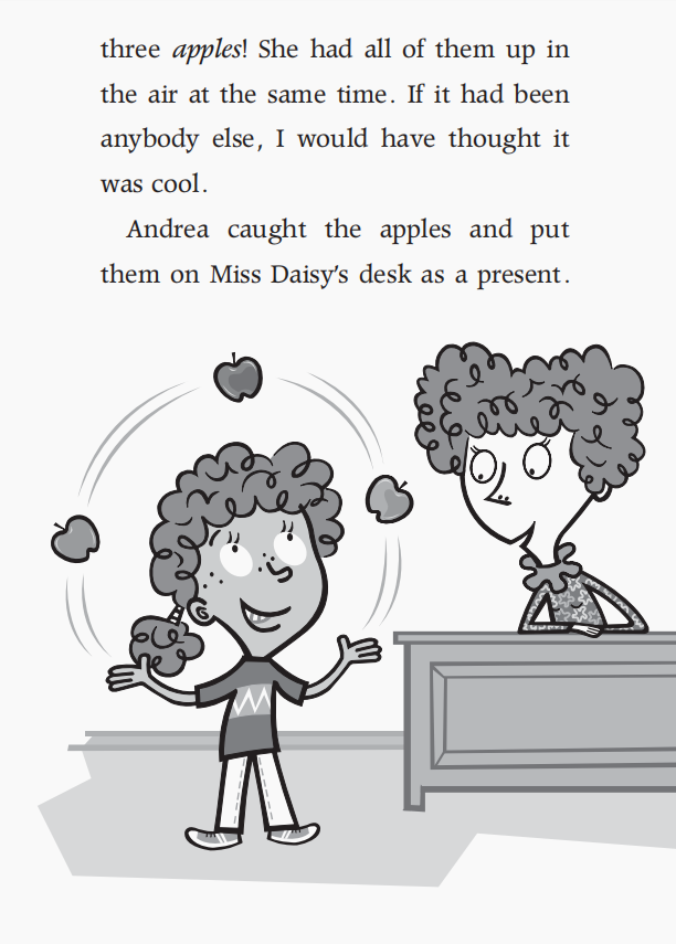 在教室前面,Andrea又在表演抛接东西的把戏。但她这次不是抛接围巾。她正在抛接三个苹果!她把它们同时抛在空中。如果换做别人,我会觉得那很酷。