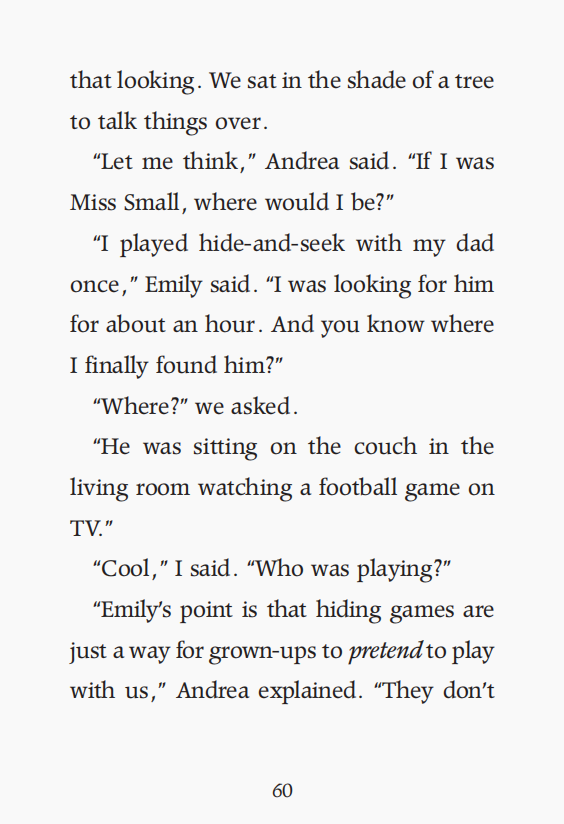 “Emily的重点是,捉迷藏游戏,只是大人们假装陪我们玩的一种方式。”Andrea解释道,“他们实际上并不想玩。他们真正想做的,是坐下来,做大人们的事情。”