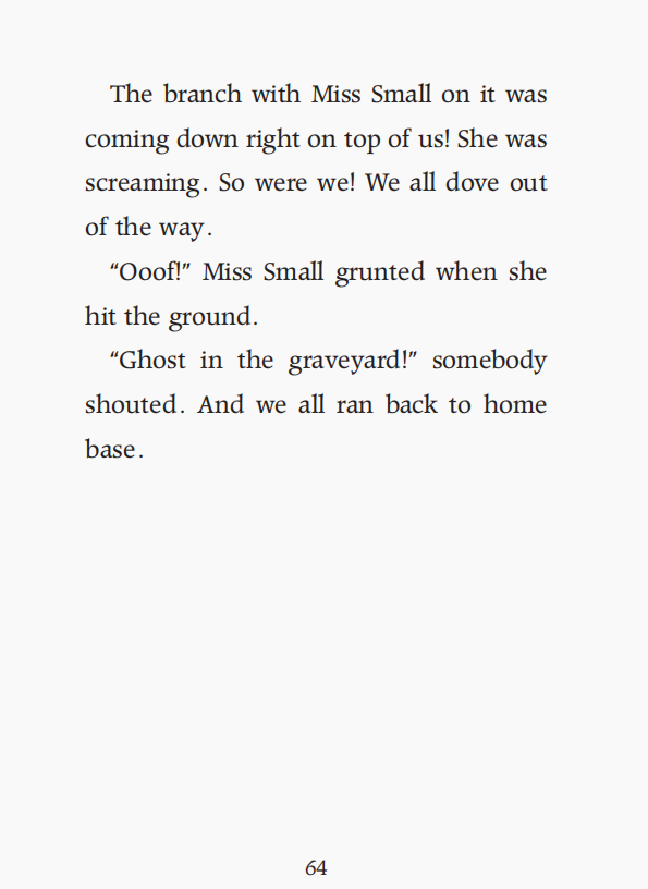 “我将藏起来,”她说,“而你们必须找到我。找到我的那个人要喊“墓地里的鬼魂”!然后大家必须在我抓到你们之前回到大本营。如果我在你回到秋千那里之前抓到你,你就是下一轮的鬼魂。”