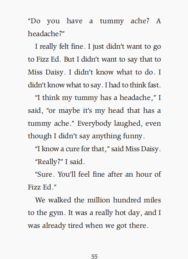 我其实很好。我只是不想去上体育课。但我不想跟Daisy小姐说这个。我不知道该做什么。我不知道该说什么。我必须快速思考。