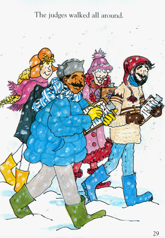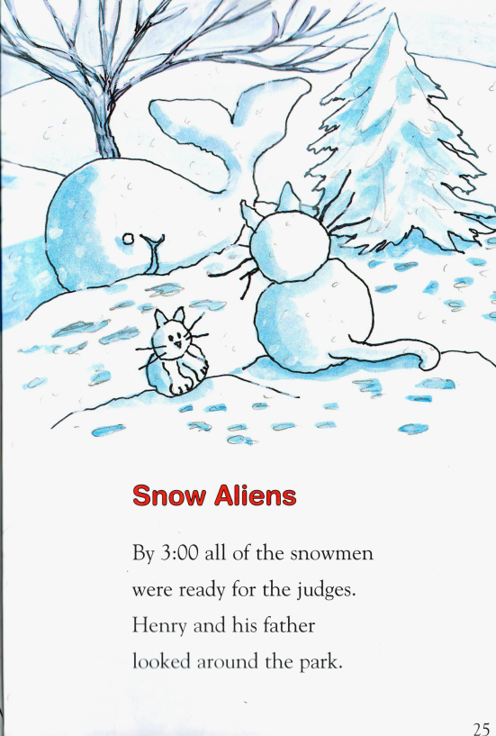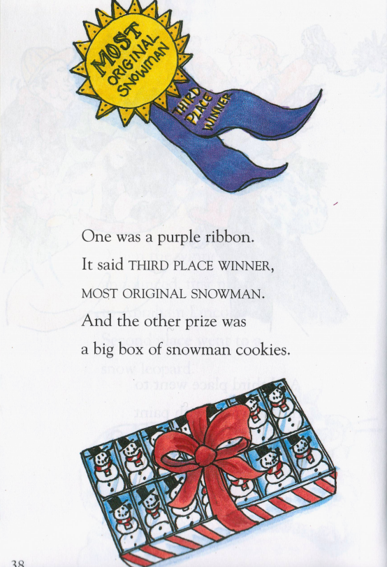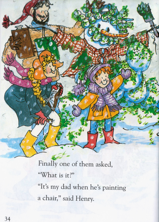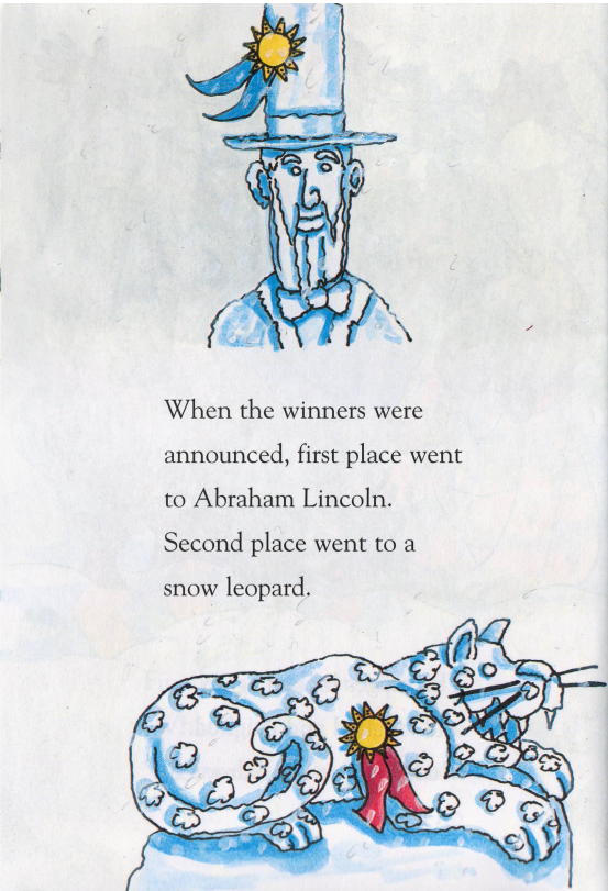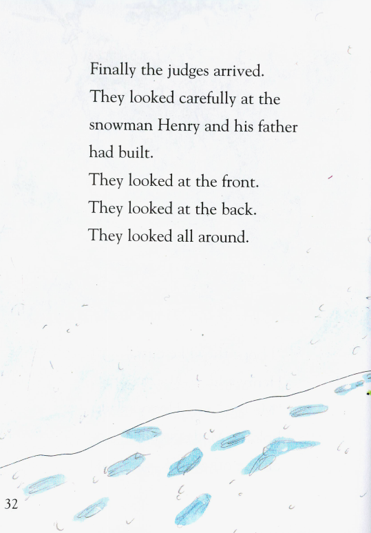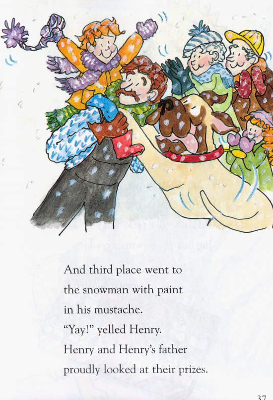 到了下午3点,所有的雪人都已完成。公园里出现了各种各样的雪人,有雪猫,雪狗,雪豹,还有用雪堆的林肯总统和外星人。Henry和爸爸堆的是雪人是:爸爸给椅子刷油漆时的样子,胡子上还带着油漆呢。最终,Henry和爸爸堆的雪人得到了第三名,并且收到了一盒雪人曲奇饼干的奖品,他们高兴极了,回到家就吃了起来