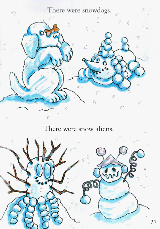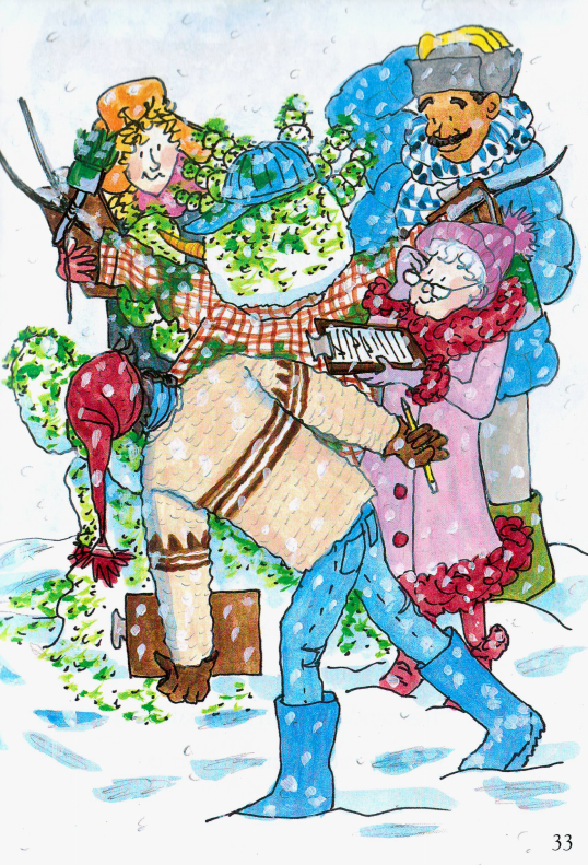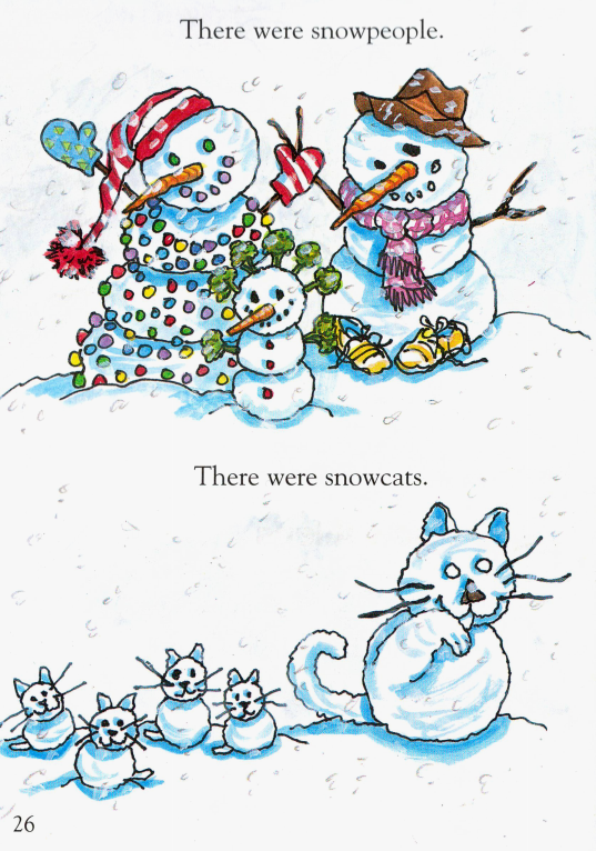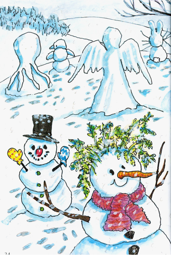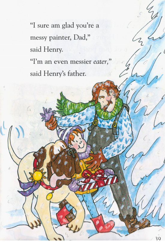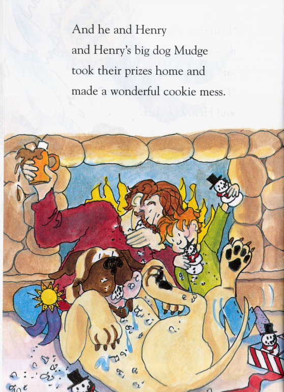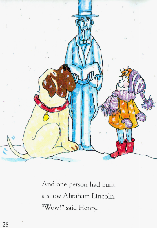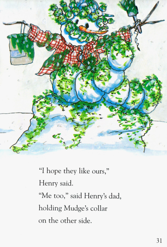 到了下午3点,所有的雪人都已完成。公园里出现了各种各样的雪人,有雪猫,雪狗,雪豹,还有用雪堆的林肯总统和外星人。Henry和爸爸堆的是雪人是:爸爸给椅子刷油漆时的样子,胡子上还带着油漆呢。最终,Henry和爸爸堆的雪人得到了第三名,并且收到了一盒雪人曲奇饼干的奖品,他们高兴极了,回到家就吃了起来