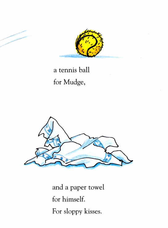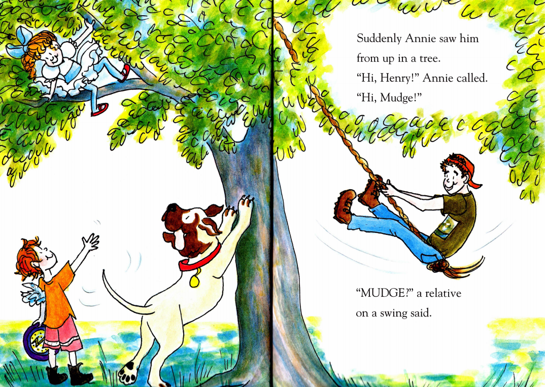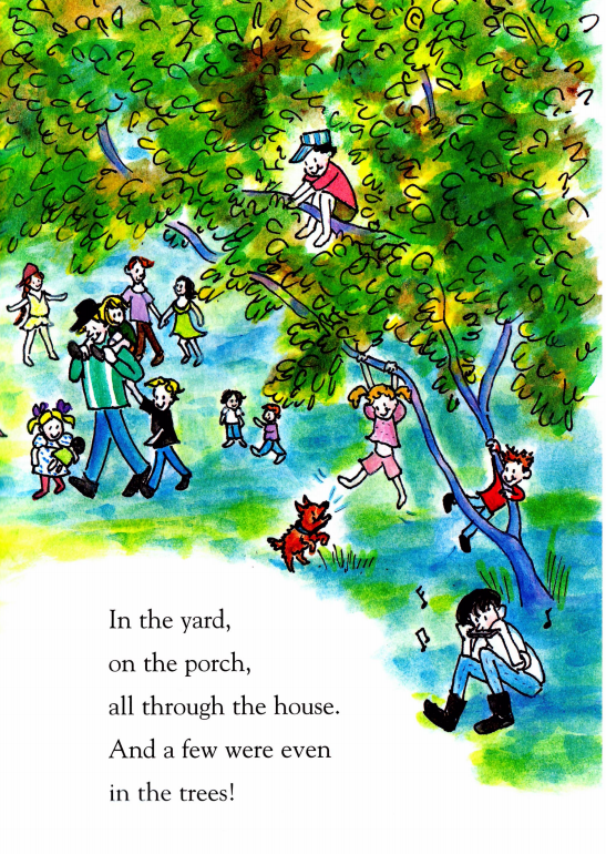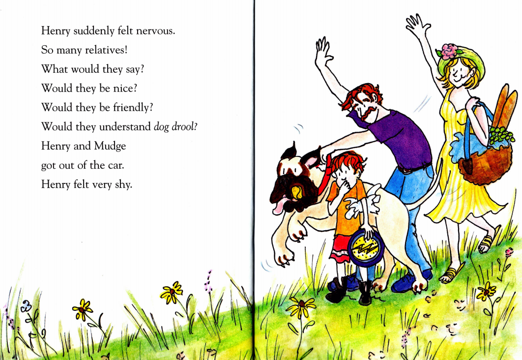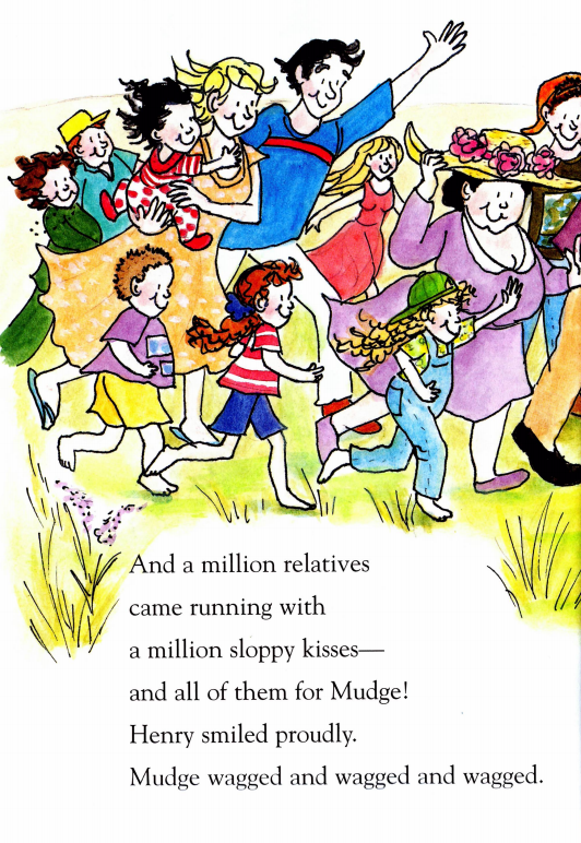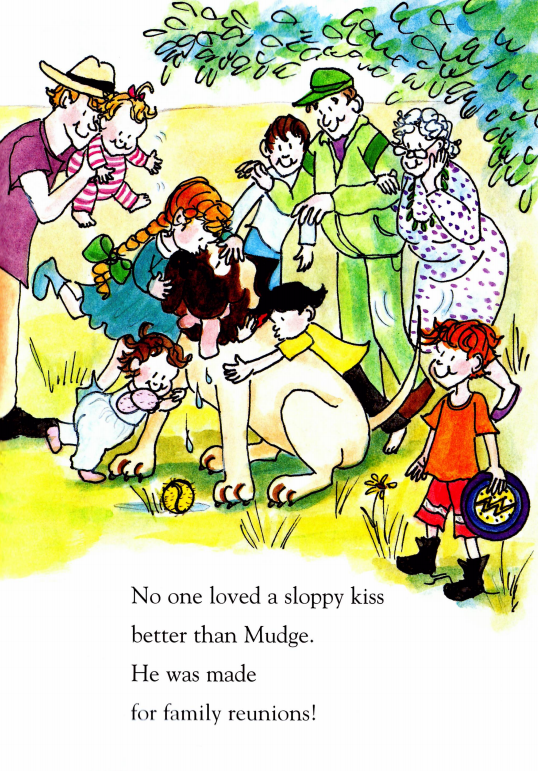Henry一家要到Annie家参加家庭聚会。Henry为Annie准备了一个新的飞盘;为Mudge带了一个网球让它玩;为自己带了一张纸巾,用来擦可能到来的亲戚们湿乎乎的吻。当他们开车到达时,已经有很多亲戚到了。Annie家到处都是人,庭院里,门廊上,屋子里......好热闹啊!而这时Henry看到这么多人,突然感到有些紧张(小朋友们,你们会不会在这种情况下也紧张呢?)。不过很快,Annie就在树上热情地跟Henry和Mudge打招呼了。当亲戚们一听到Mudge的名字,都很兴奋,纷纷跑过来亲吻Mudge。原来湿乎乎的吻是献给Mudge的
